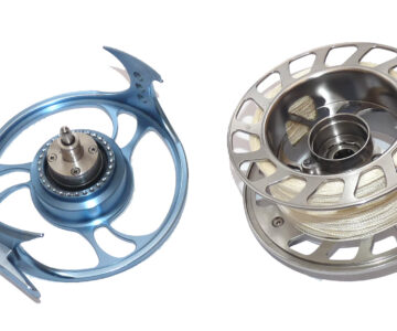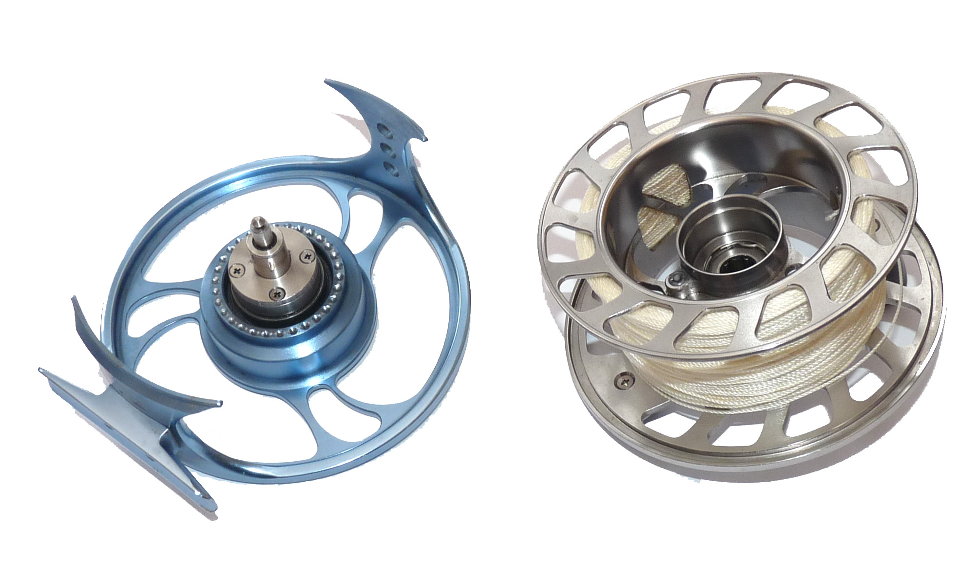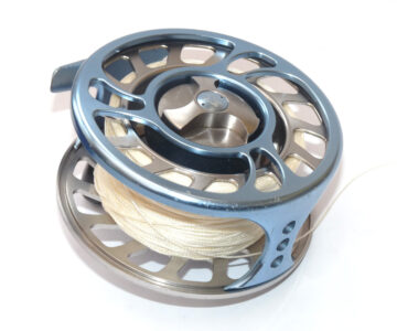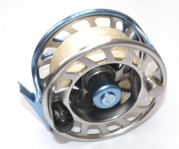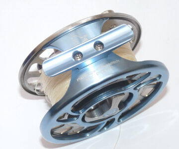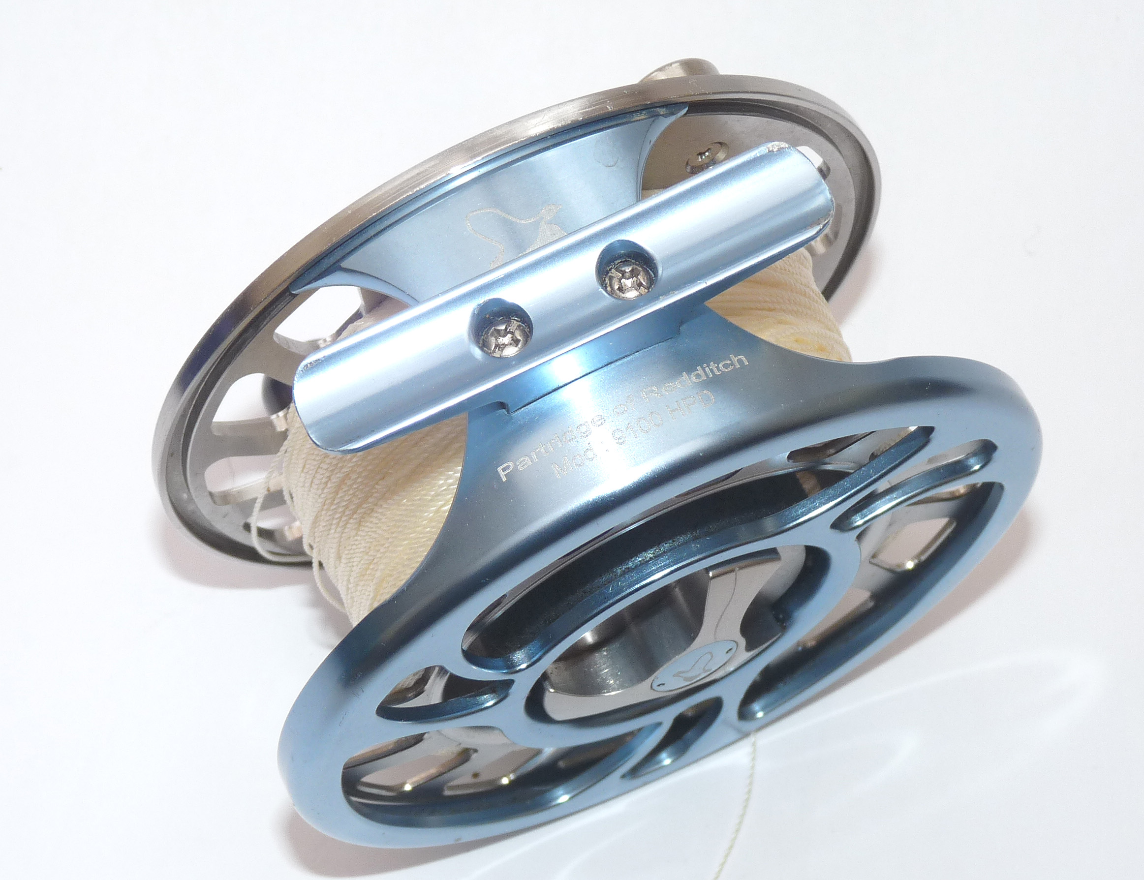 Partridge of Redditch 9100 HPD large arbor fly reel in fine pre-owned condition. 105mm diameter, 49mm across the frame, rear drag disc adjuster. counterbalanced handle, quick release spool.The reel is currently set for left-hand wind. A stunning reel with very minor marks only. Finished in light blue/silver finish and fitted with a low noise check.