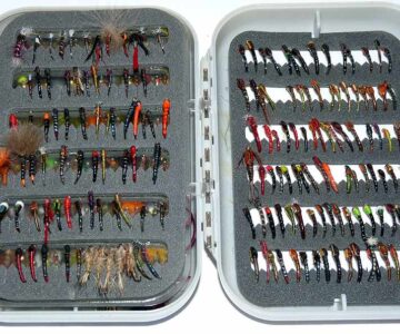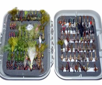 TT opinion: Three good pocket fly boxes, 2 Greys with central folding leaf and 1 Orvis. Allboxes stuffed with hundreds of trout grayling flies, buzzers nymphs wets dry, gold heads, you name it, its in here, most appear unused