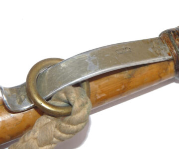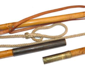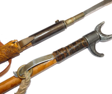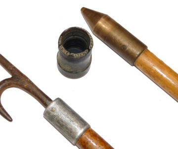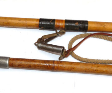 Pair of vintage Hardy bamboo shaft combined wading staff and gaffs, the 48” 2 piece long wading staff is fitted with alloy thumb crotch, spring belt clip, rope lanyard and boat hook to base, the combined gaff and staff has a spring point protector to removable gaff head, brass socket stamped with Hardy’s details, perished rubber grip, flimsy leather lanyard and brass spike with rubber cup, great display pieces from this famous maker.