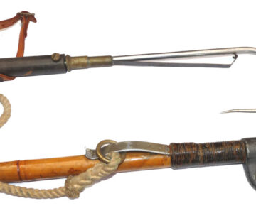 Pair of vintage Hardy bamboo shaft combined wading staff and gaffs, the 48” 2 piece long wading staff is fitted with alloy thumb crotch, spring belt clip, rope lanyard and boat hook to base, the combined gaff and staff has a spring point protector to removable gaff head, brass socket stamped with Hardy’s details, perished rubber grip, flimsy leather lanyard and brass spike with rubber cup, great display pieces from this famous maker.