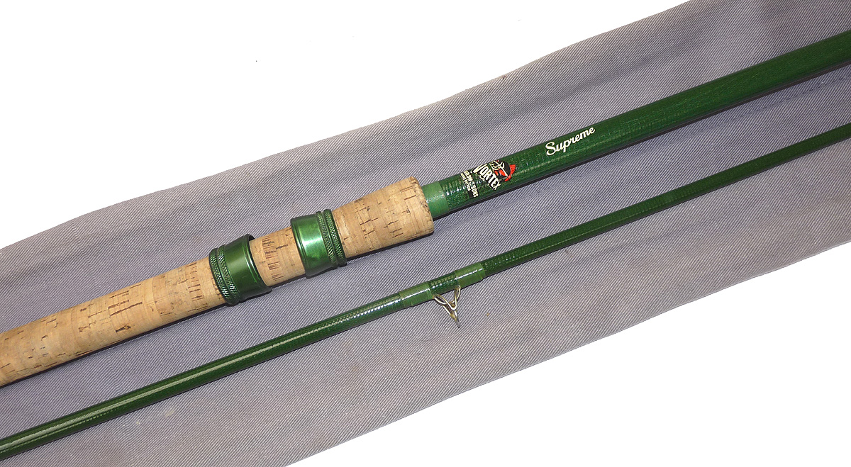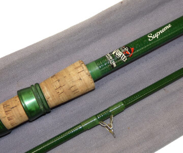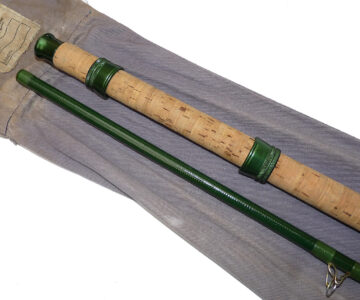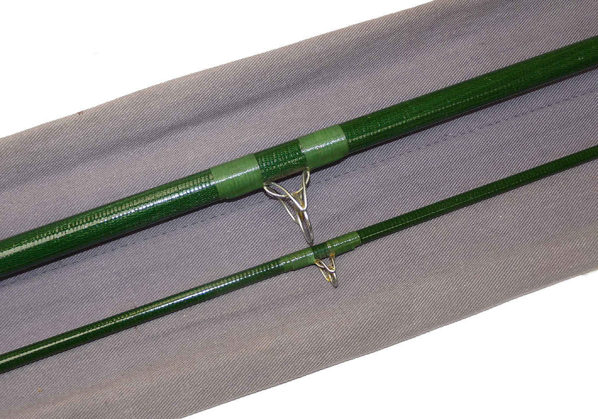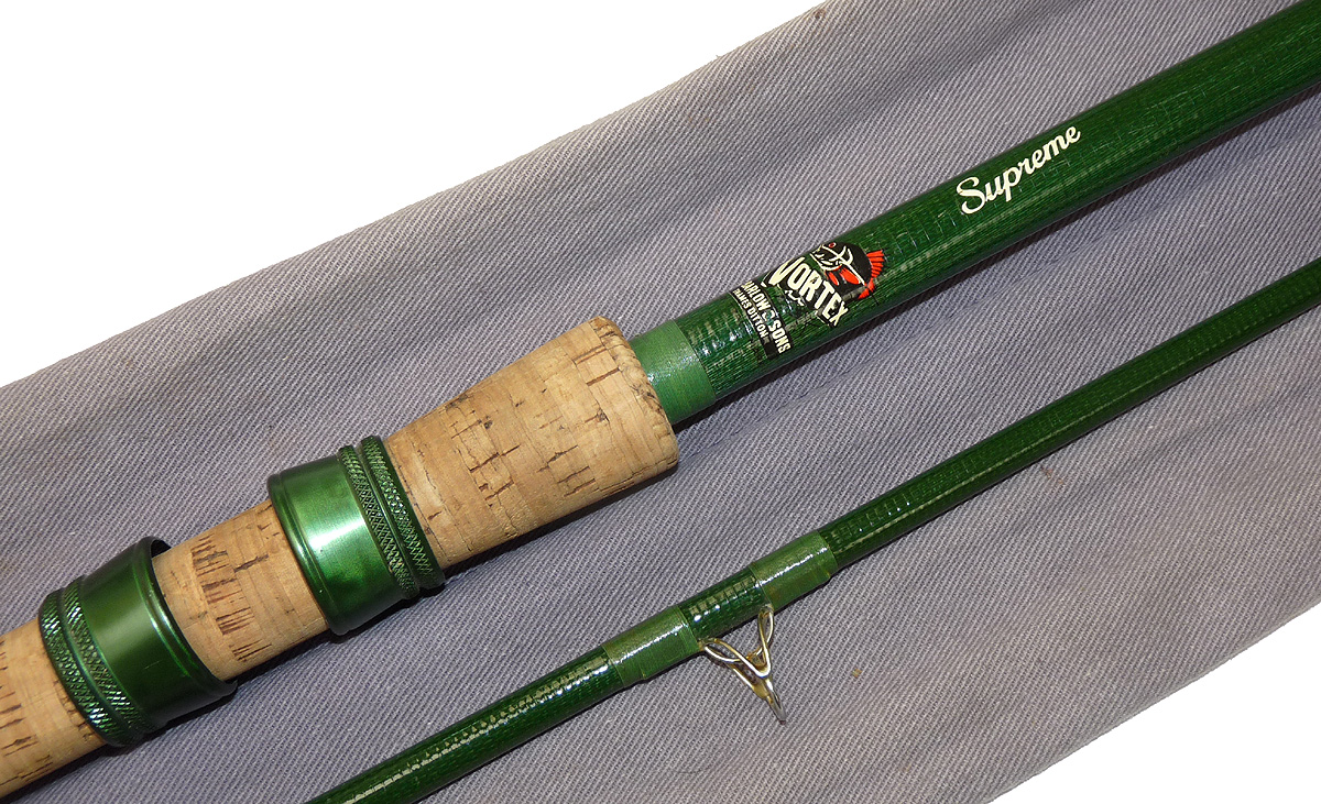 TT opinion: E T Barlow and Sons of Thames Ditton, England the Vortex Supreme 10’ 2 pce hollow glass carp or pike rod in fine condition. light to handle with plenty of power. Green whipped full bridge guides. Spigot ferrule, 29’5” cork handle with green anodised alloy fittings. A classic 60/70’s rod in fine condition with makers original cloth bag,label to top flap.
