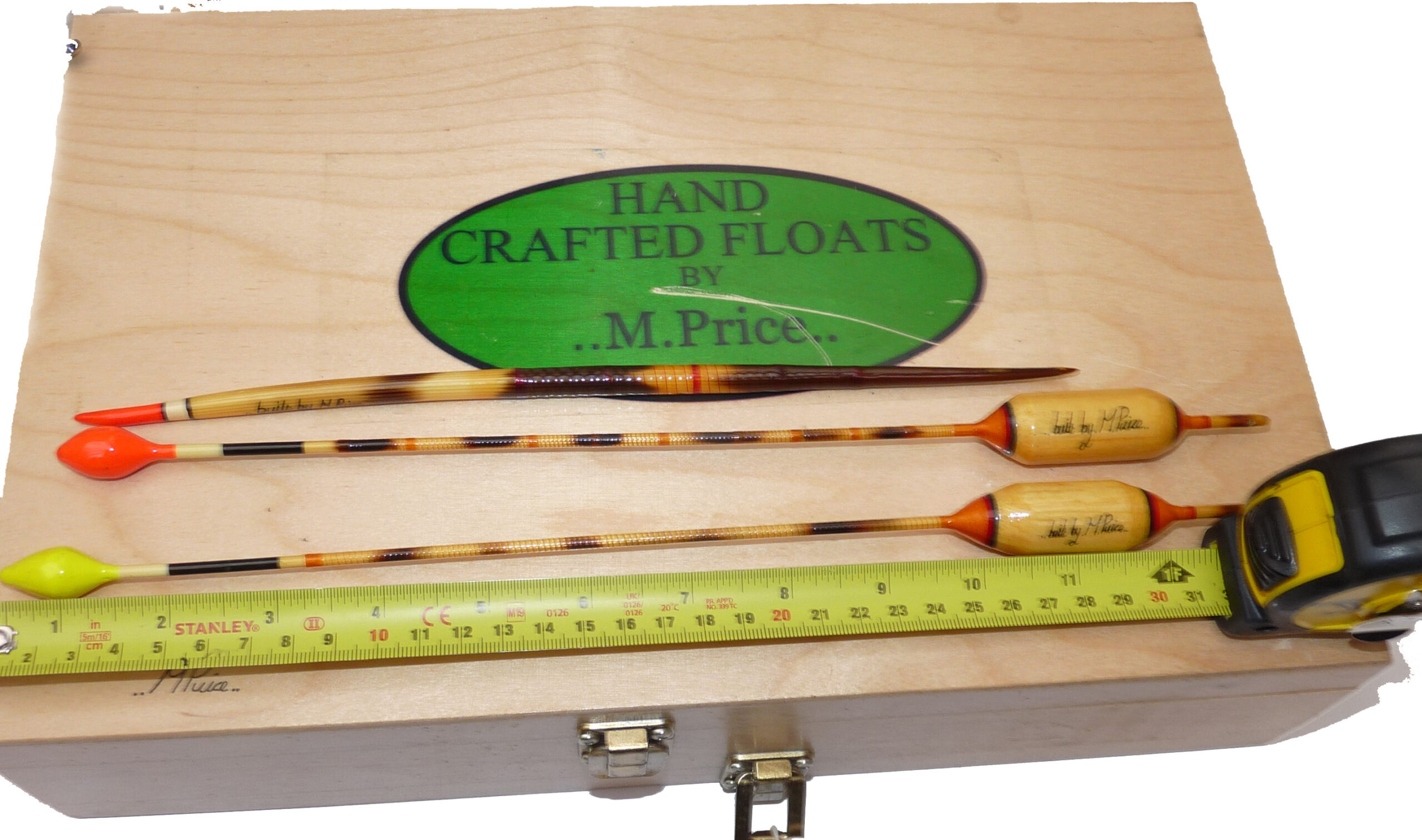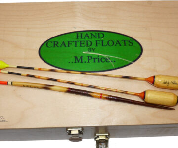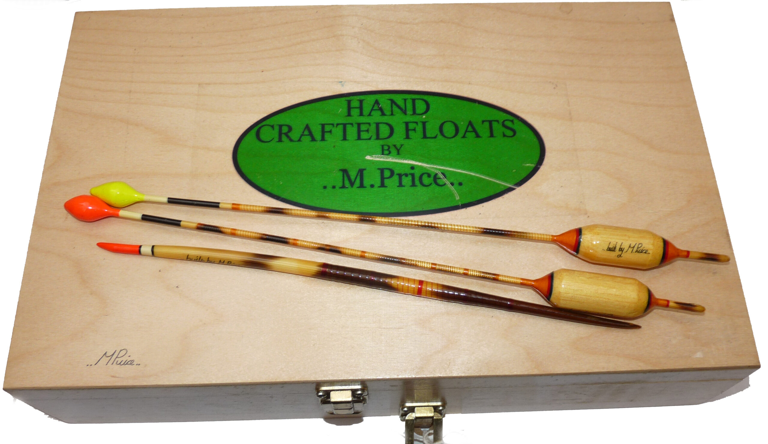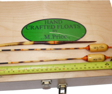 3 Mark Price hand made large coarse fishing floats dated 2003 measuring up to 12″ long, real distance casting floats, 2 Antenna patterns and one quill, plus a signed wooden 3 later float box 14″ x9″ x3.5″ with Mark Price vinyl decal to lid, good collection