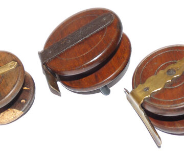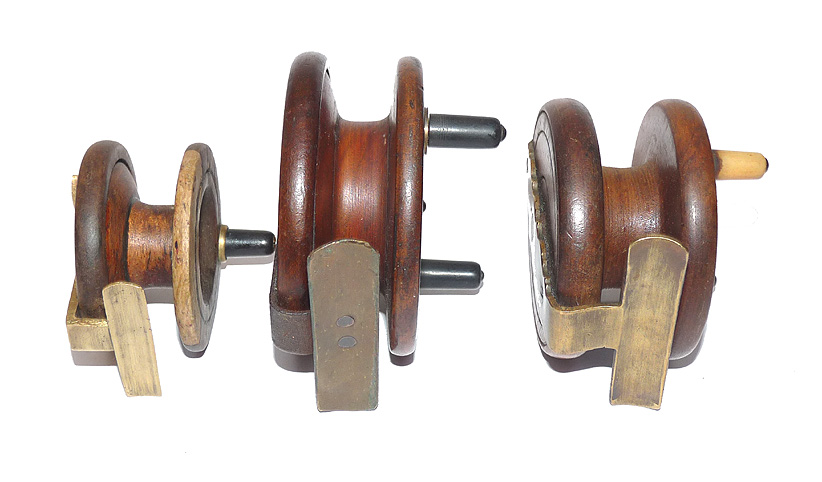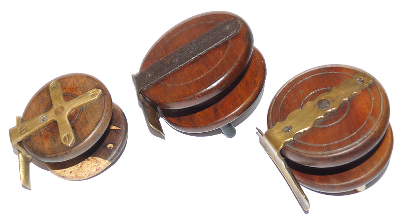 A good mixed collection of antique Nottingham fishing reels. 3.5” iron strap back, riveted brass foot & black handles, c.1890. A 3” example with scalloped brass strap back & bone handles, c1900’s, plus, a curious 2.5” single handed Nottingham with early star back, great looking reels for the collector.