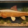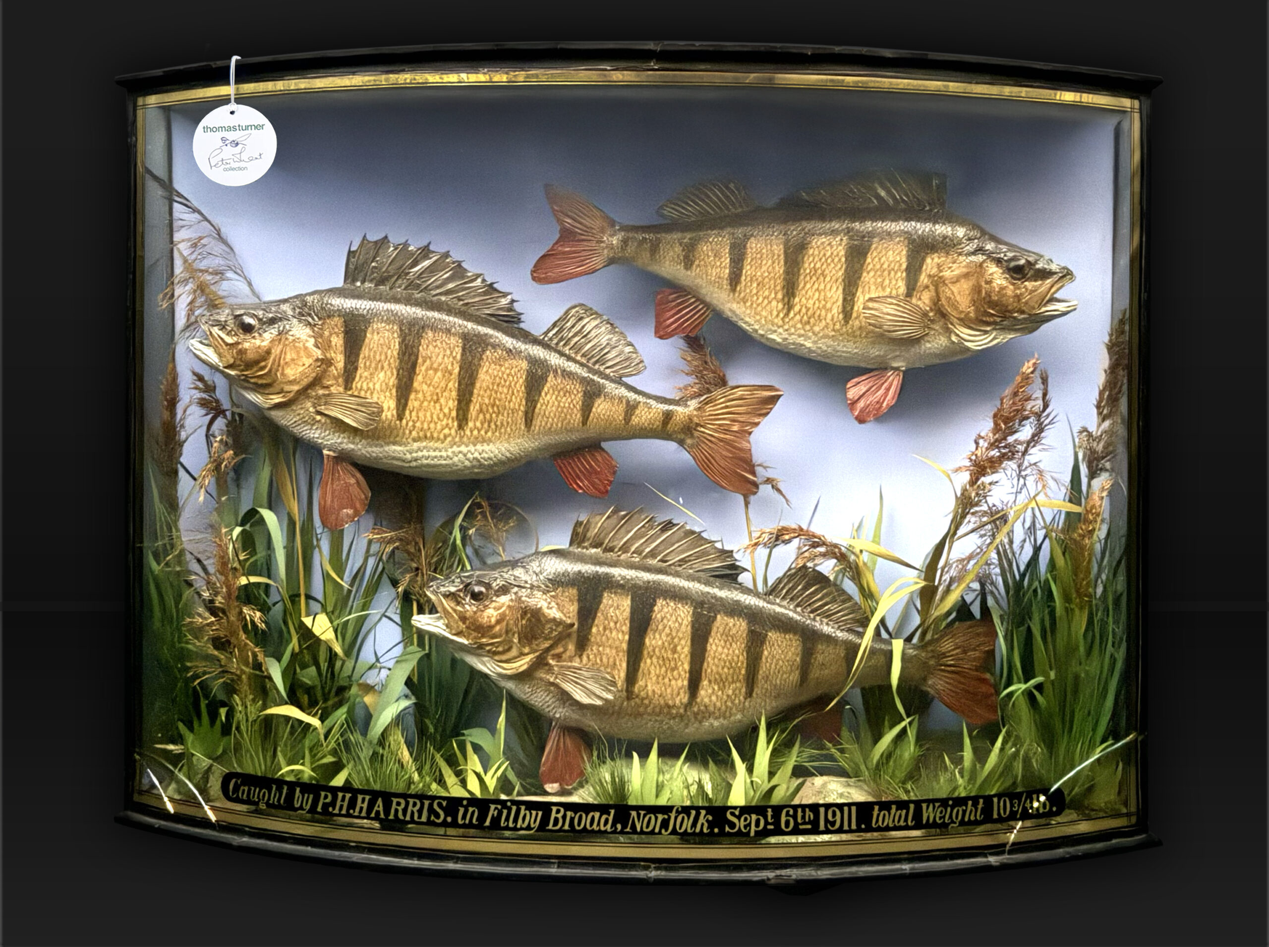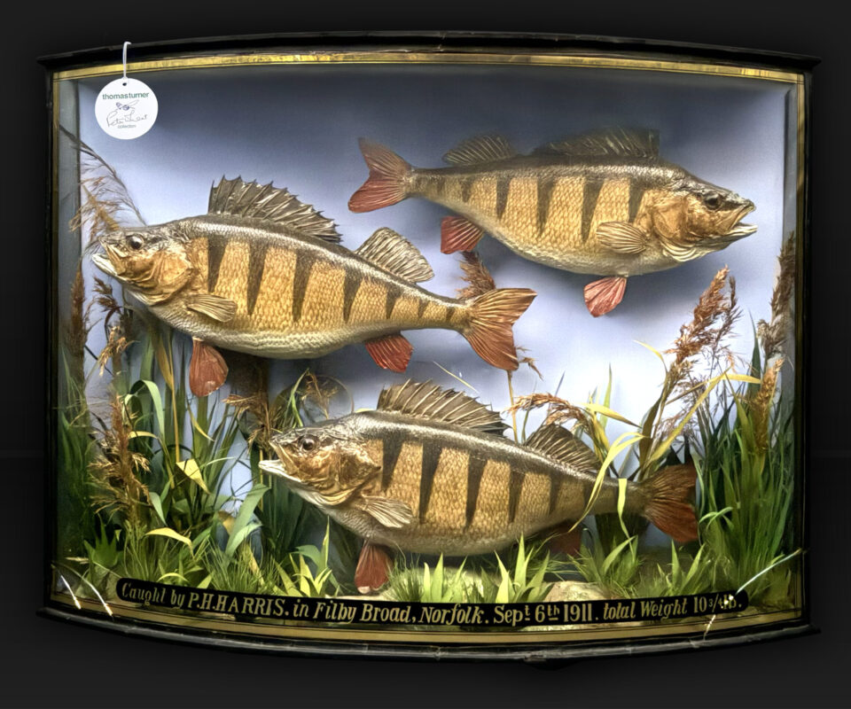 Very large, very rare and impressive bow fronted case containing 3 Specimen sized Perch total weight 10 3/4lbs. Average weight 3.58lbs! Taxidermy by W. Lowne of Great Yarmouth.