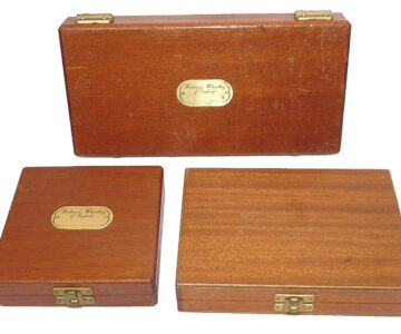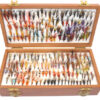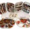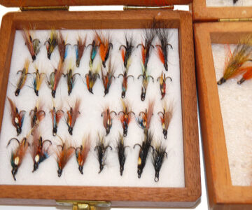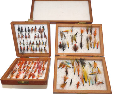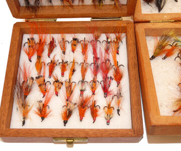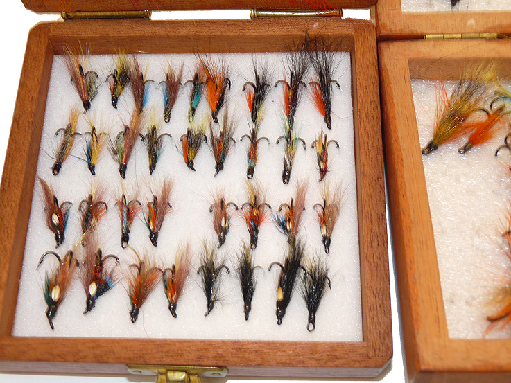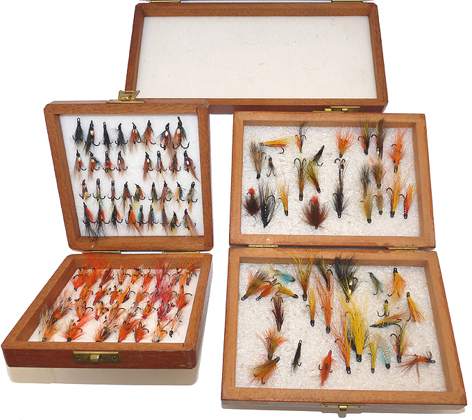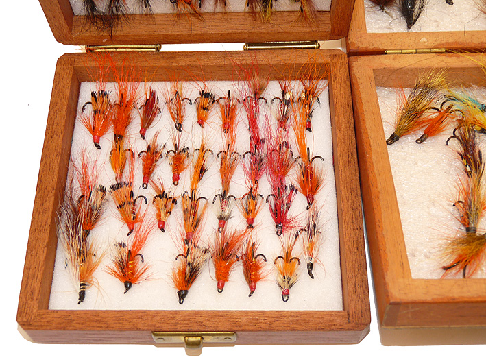 Notes: Three Wheatley of England wood fly reservoir boxes with brass fittings. A good collection of over 100 salmon flies in a variety of patterns. sizes range from “wee doubles” to larger doubles and trebles. A mix of hair wings, some with Jungle Cock feathers and many shrimp patterns too. This came from a large game fishing collection where only the best was bought
