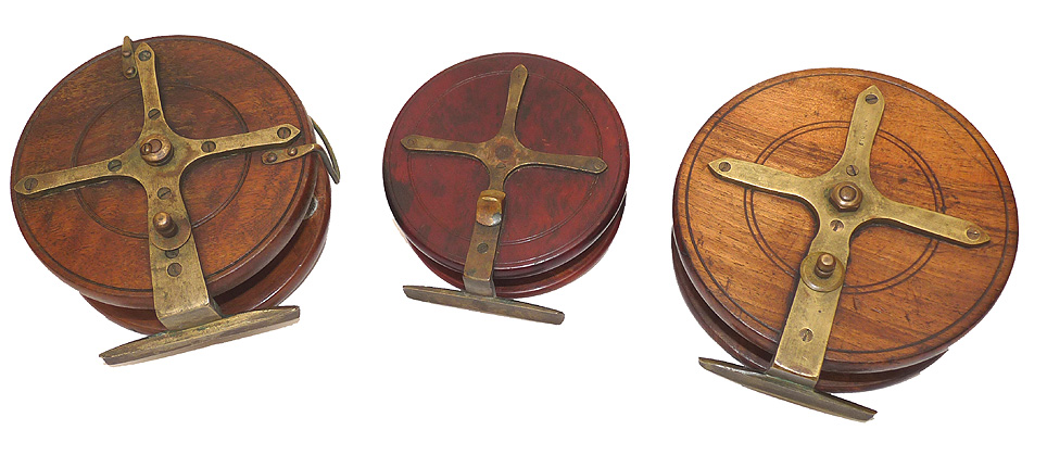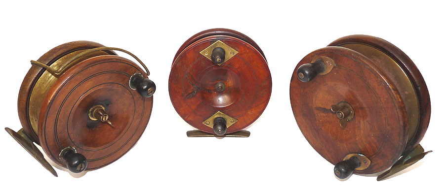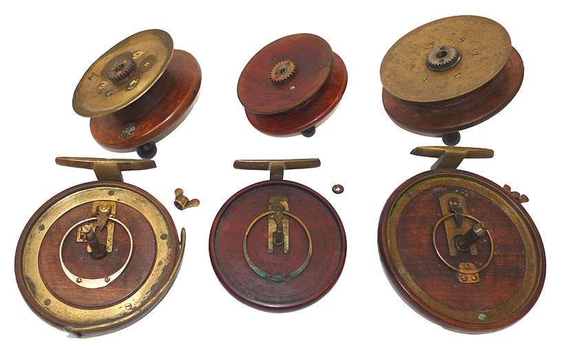 3 x Nottingham antique English wood & brass reels, 6”, 5.5” & 5”, with check clickers.