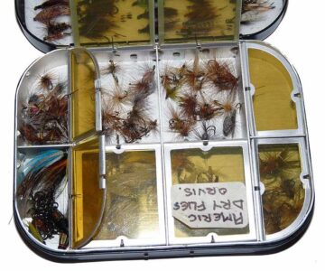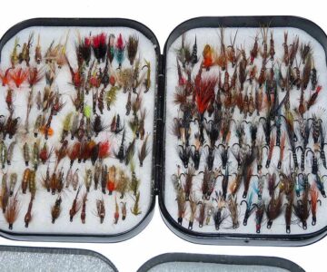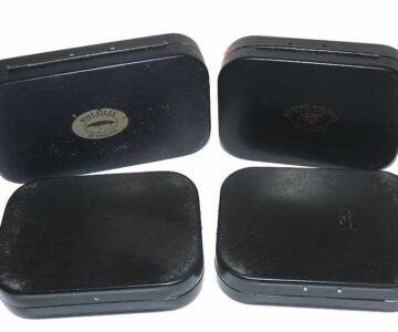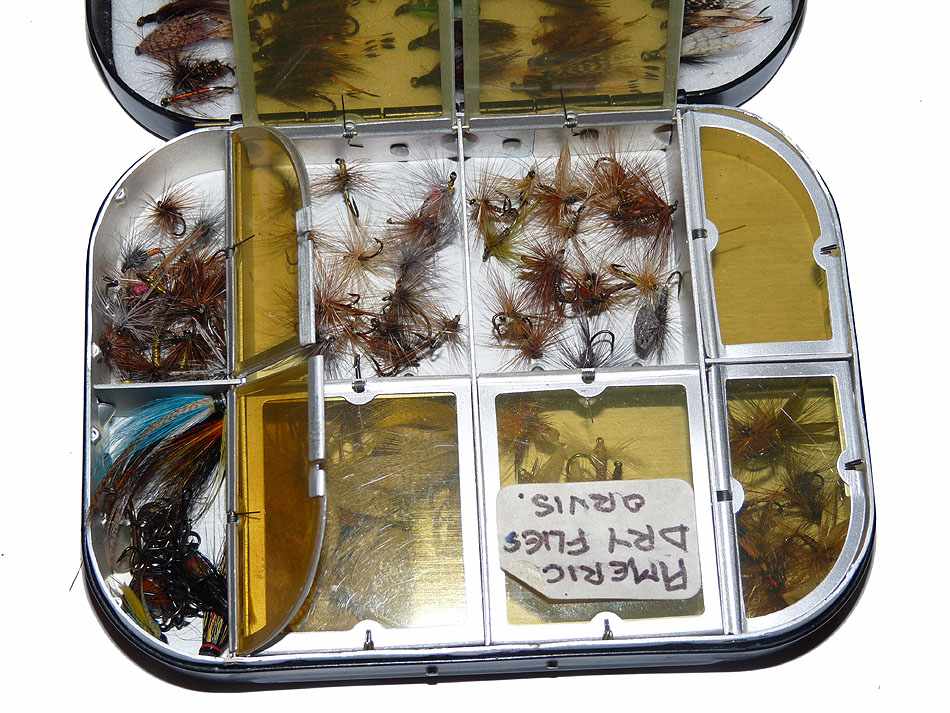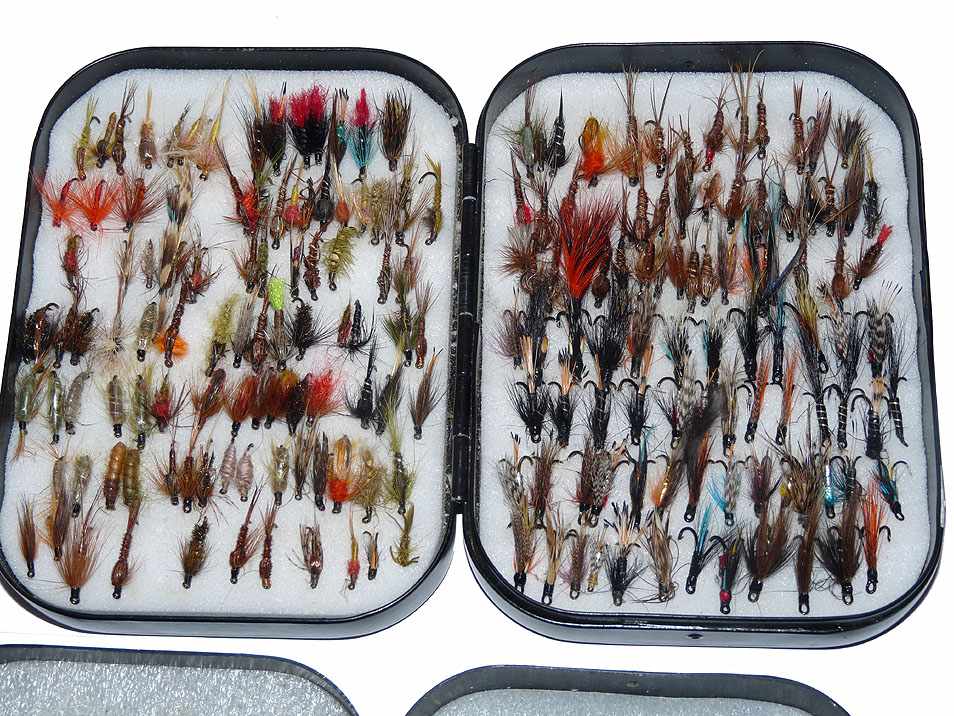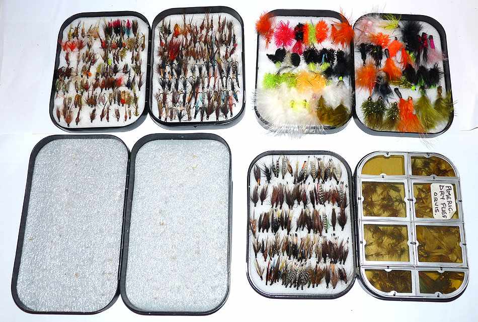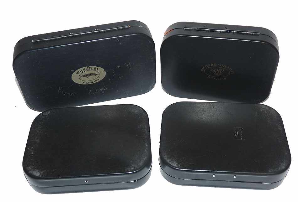 TT opinion: Four Wheatley of England black edition pocket alloy fly boxes. 1; foam-backed model filled with hundreds of trout flies, nymphs, and lures plus a few salmon wee doubles, 2; Similar box with stepped foam interior, brown and rainbow lures marabou tails, sparkle, etc. 3; a rare dry and wet box with 8 spring lid compartments holding traditional wet and dry flies and 4; an empty foam lined box .All good exterior condition, no damage or dents. 4 high-quality boxes with hundreds of flies ready to fish.