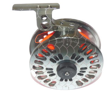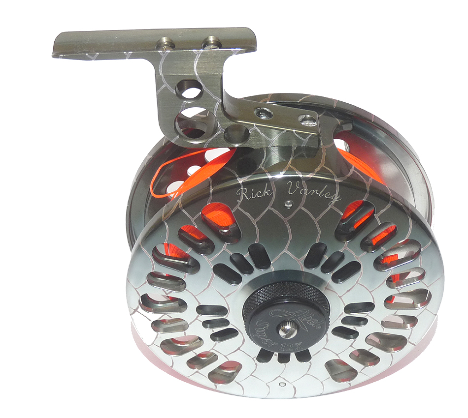 An Abel super 12X saltwater fly reel in a grey silver fade scale finish, 4.5″ diameter, 40mm across the frame, left-hand wind with rear drag adjustor. Crank alloy block foot, stamped A9484 Made in the USA, 99% original finish, makers name factory finely engraved to the backplate (barely visible). Stunning saltwater reel for tarpon etc, comes in maker’s original case.