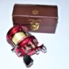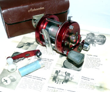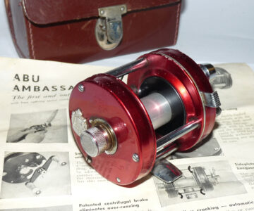 Abu, Sweden Ambassadeur 5000 multiplier reel, foot stamp 741003, level wind, star drag & free spool, lacking handle screw, retains most original finish, comes with leaflet, spares in alloy tub, spare handle & maker’s leather case with owner’s details inside flap. A great reel ready to fish or to add to your collection.