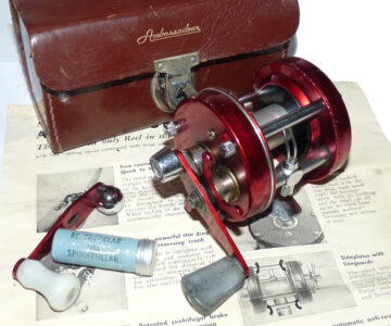 Abu, Sweden Ambassadeur 5000 multiplier reel, foot stamp 741003, level wind, star drag & free spool, lacking handle screw, retains most original finish, comes with leaflet, spares in alloy tub, spare handle & maker’s leather case with owner’s details inside flap. A great reel ready to fish or to add to your collection.