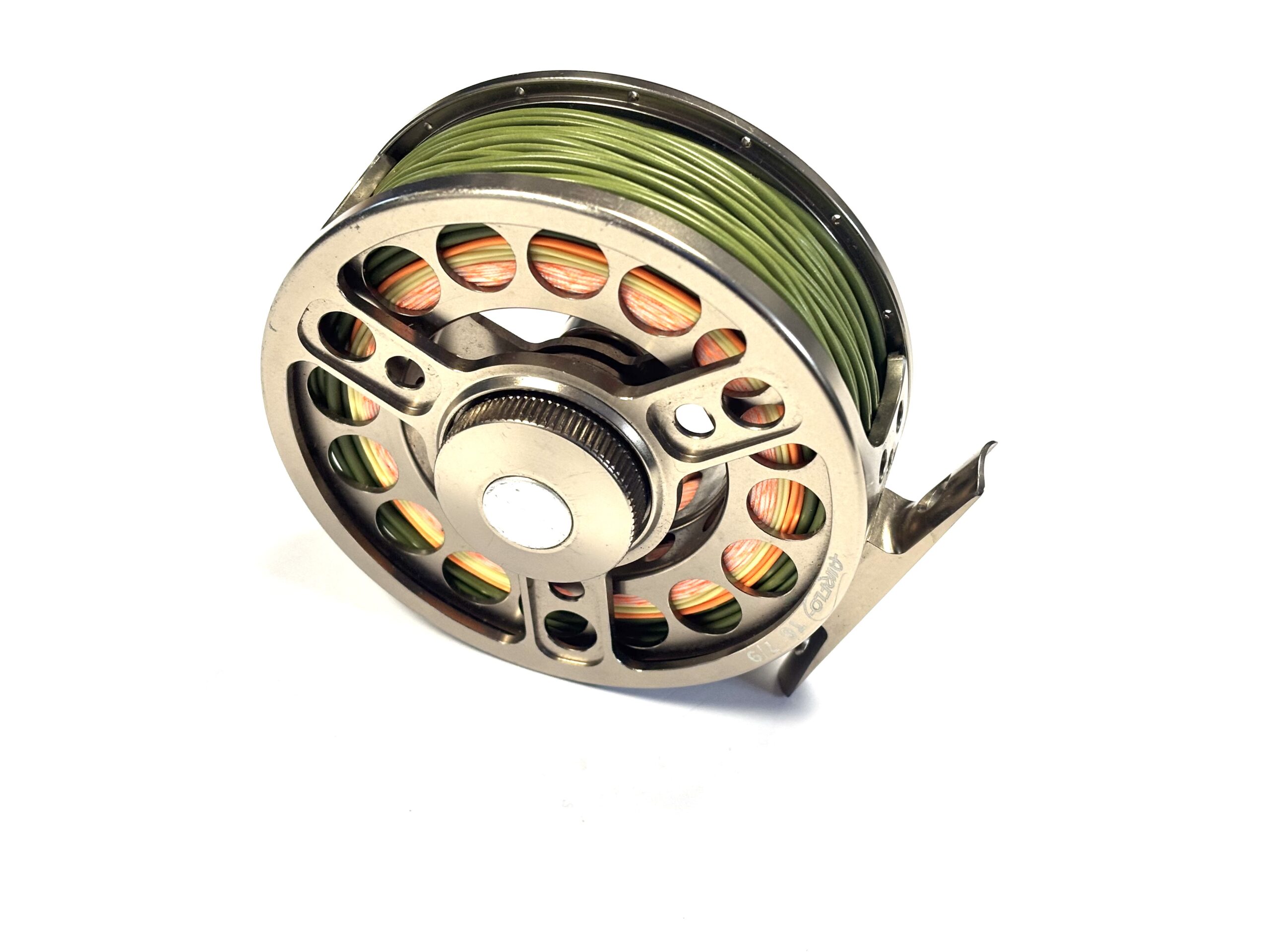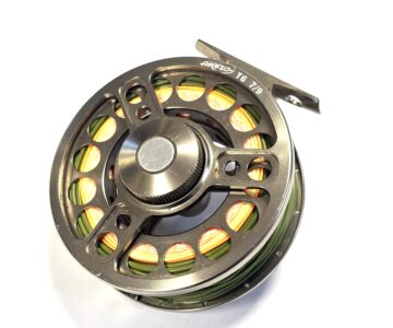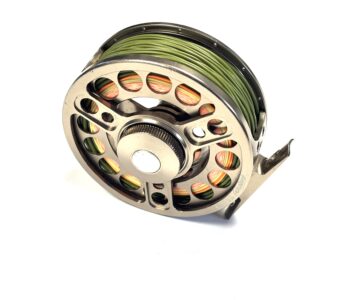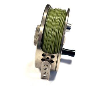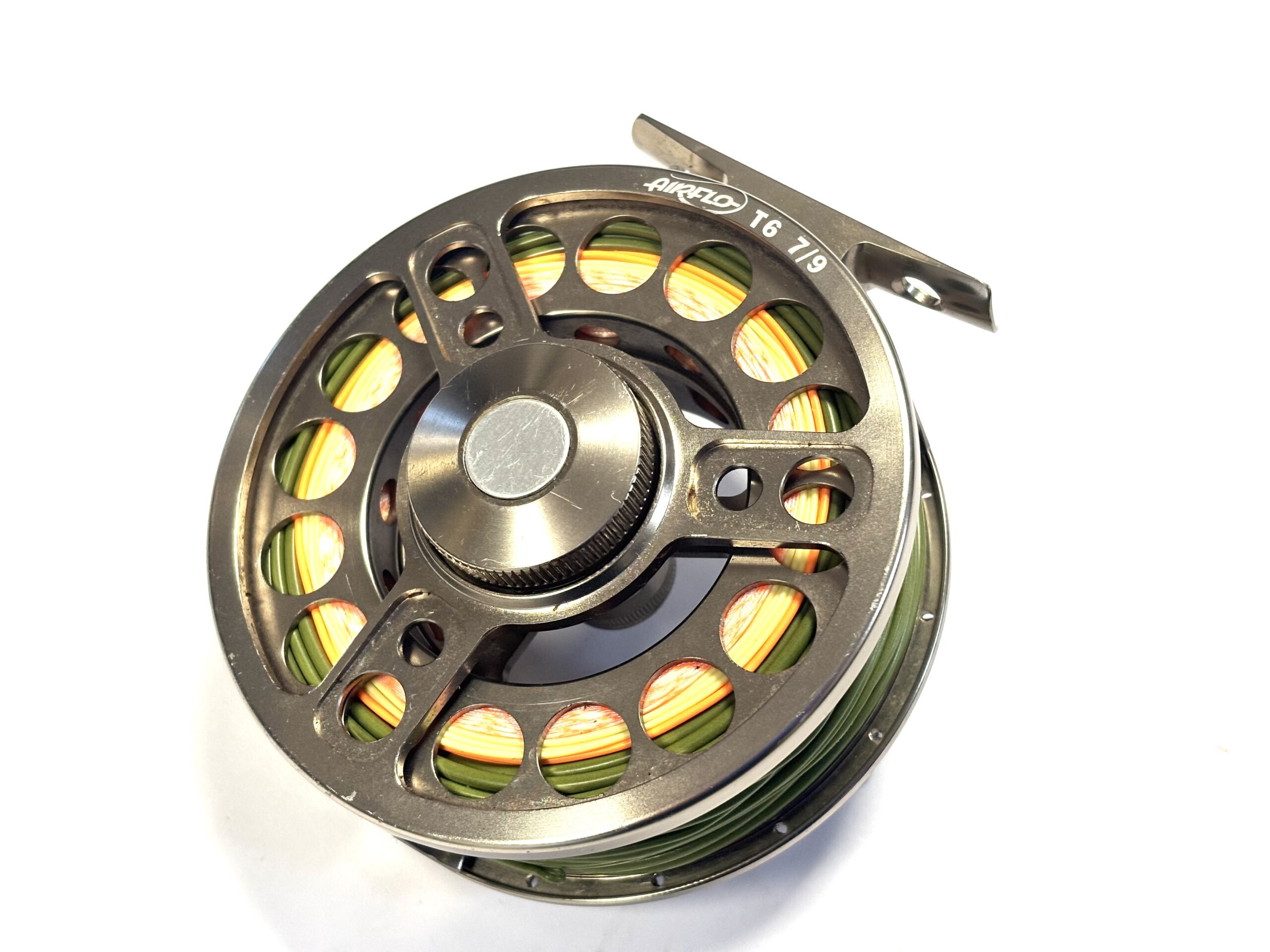 Thomas Turner Opinion: A very good example of the Airflo T6 7–9 fly reel, featuring a large circular disc drag mounted to the rear plate. Perforated spool and pillars, with black handle and silver counterbalance. Supplied loaded with a quality floating green #7 line.
