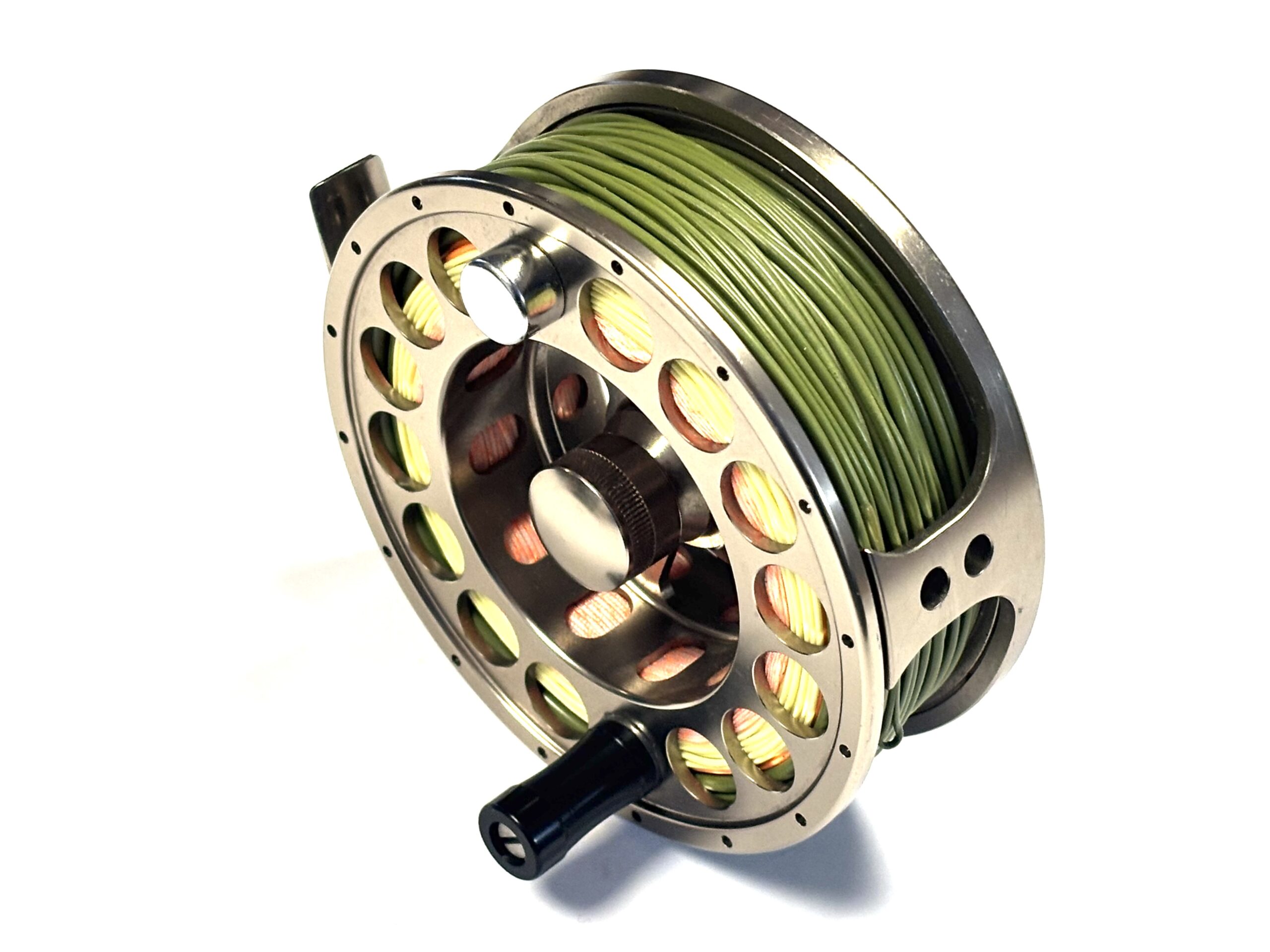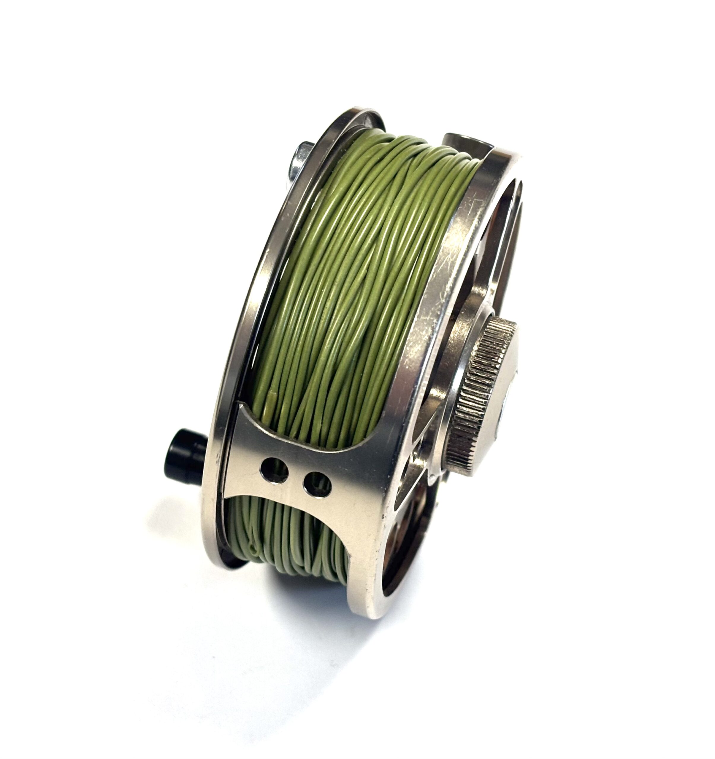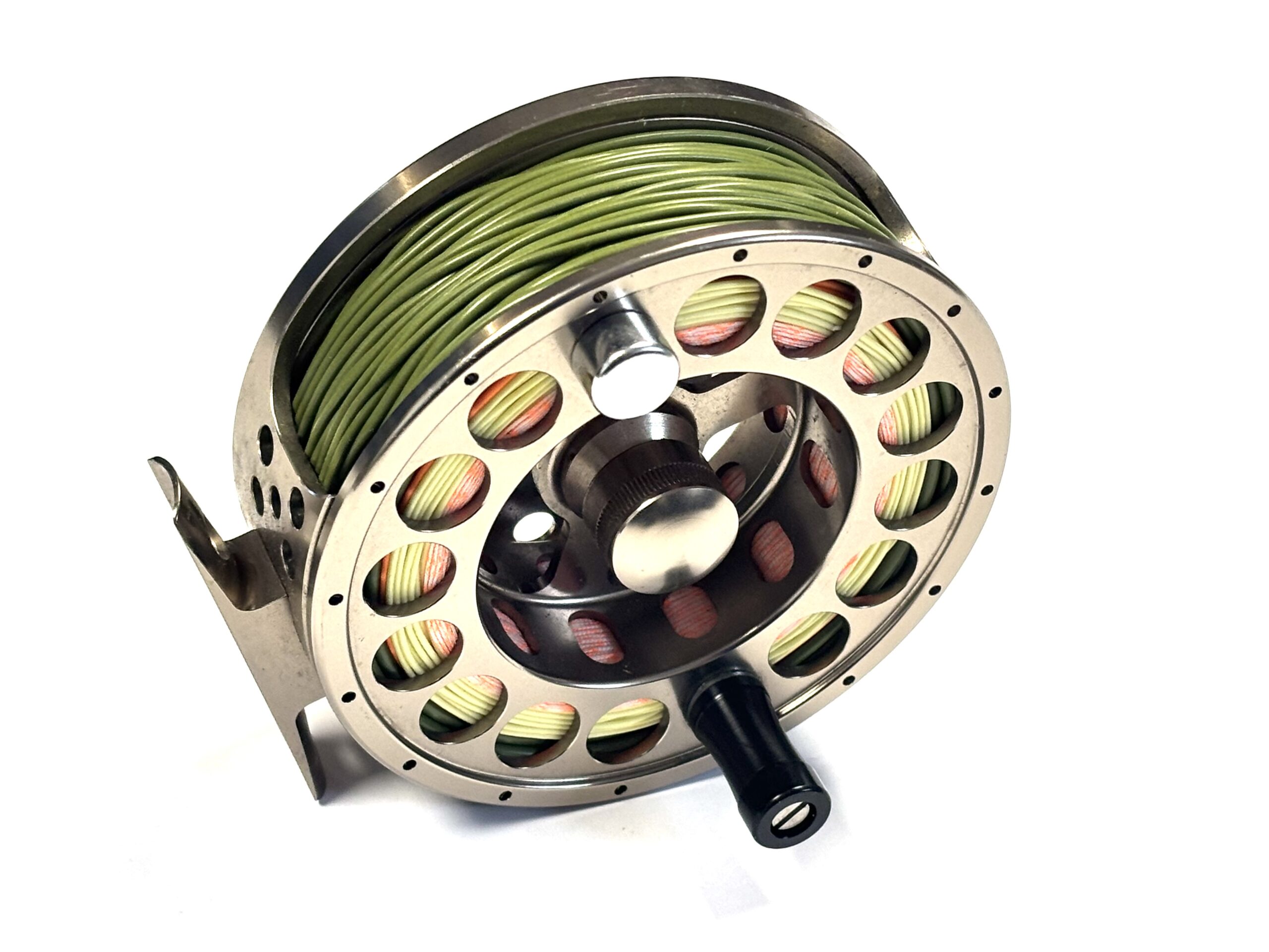 Thomas Turner Opinion: A very good example of the Airflo T6 7–9 fly reel, featuring a large circular disc drag mounted to the rear plate. Perforated spool and pillars, with black handle and silver counterbalance. Supplied loaded with a quality floating green #7 line.