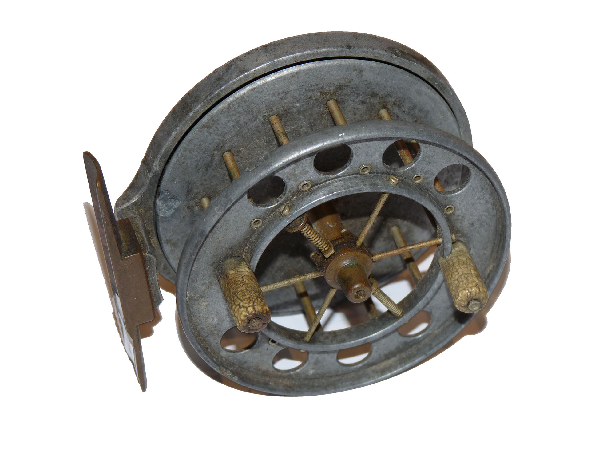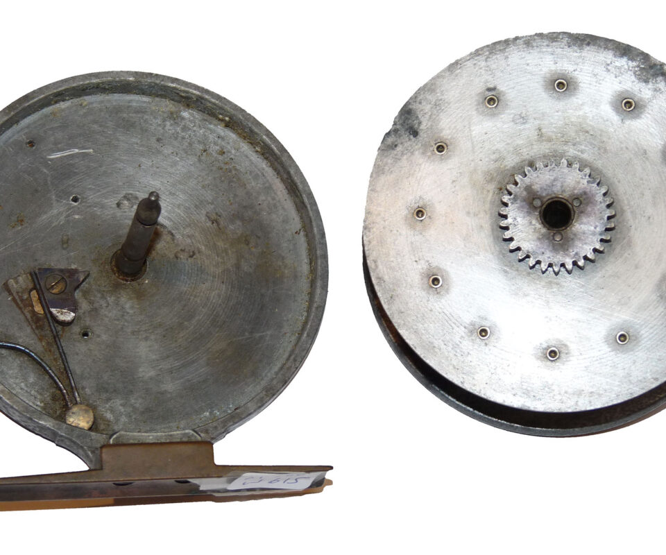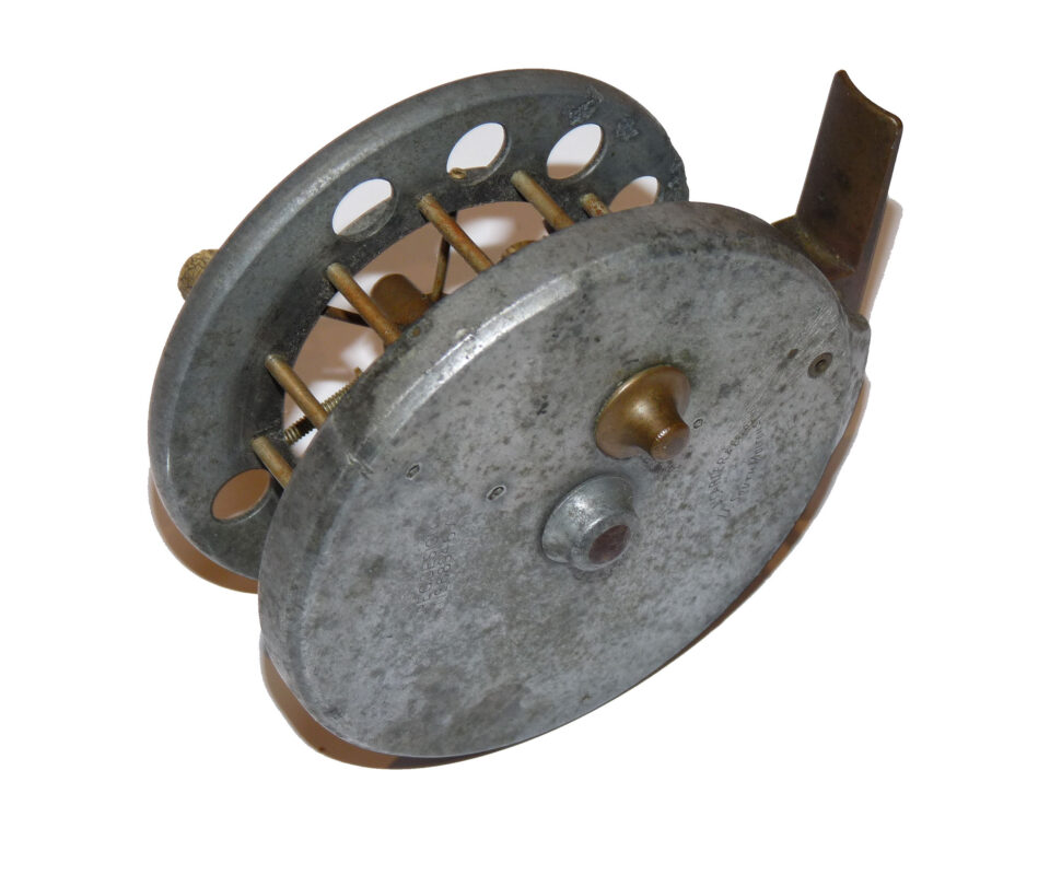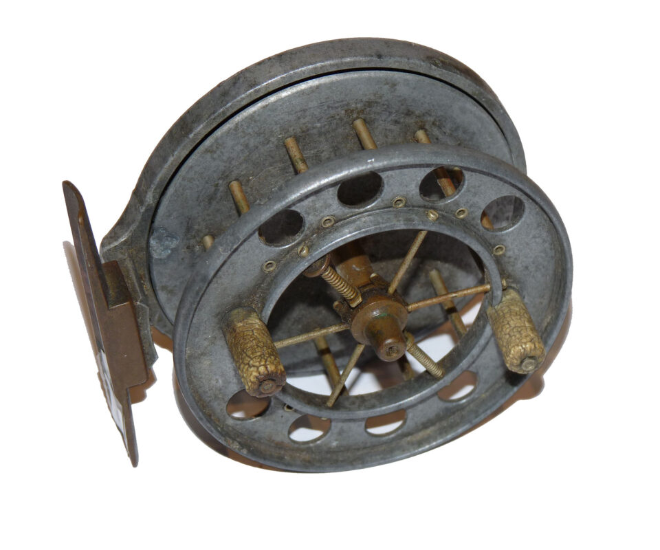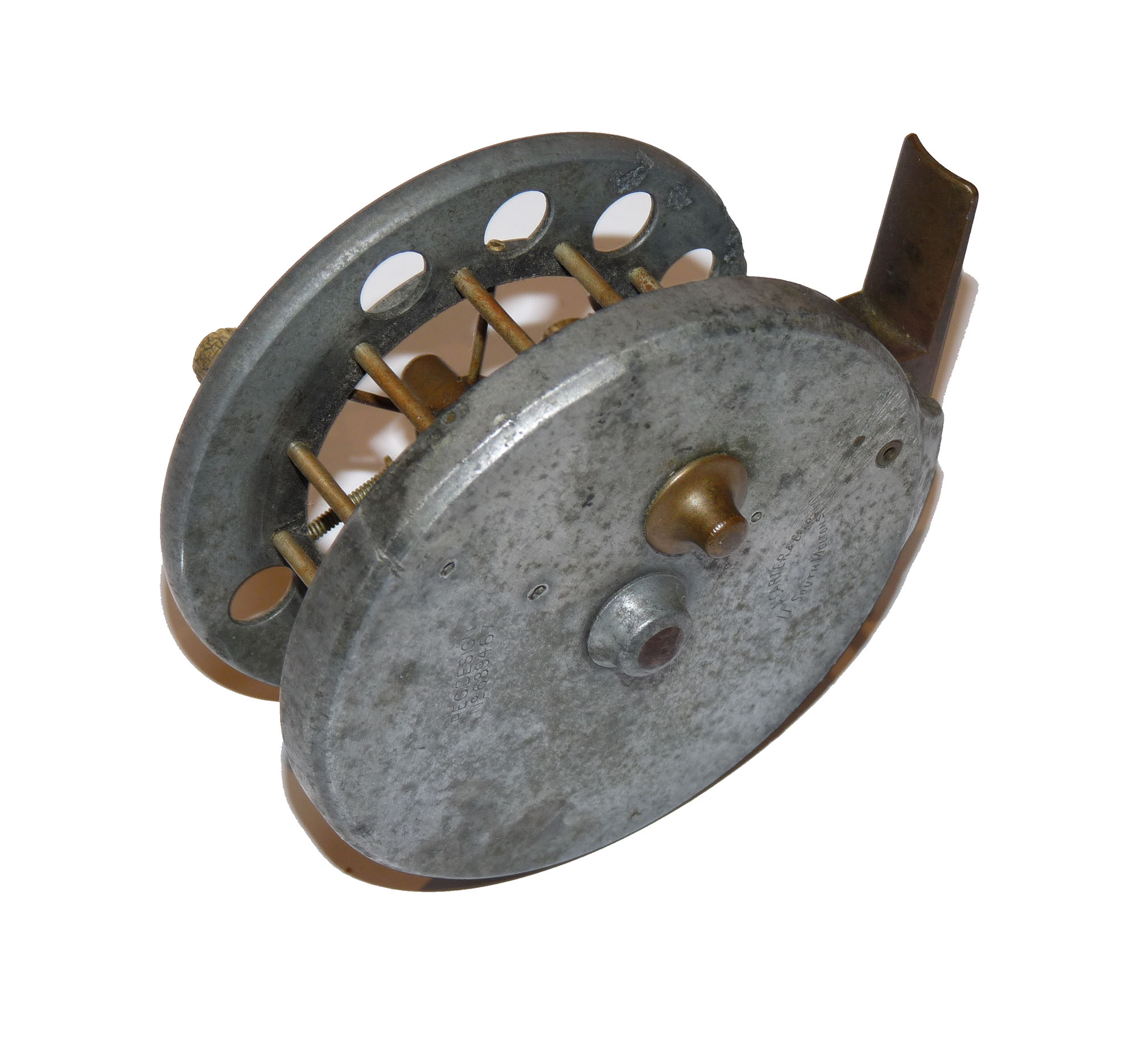 Allcock Ventilated Aerial retailed by A Carter 7 Co South Molton, with xylonite handles, 8 holes to face plate, 77mm straight brass foot and brass on/off check button to rear plate. Brass check button slides back into the ‘check on position’ and there is a very small chip in the rim and the spool wont engage. Needs some minor attention. Three minute holes in rear plate.
