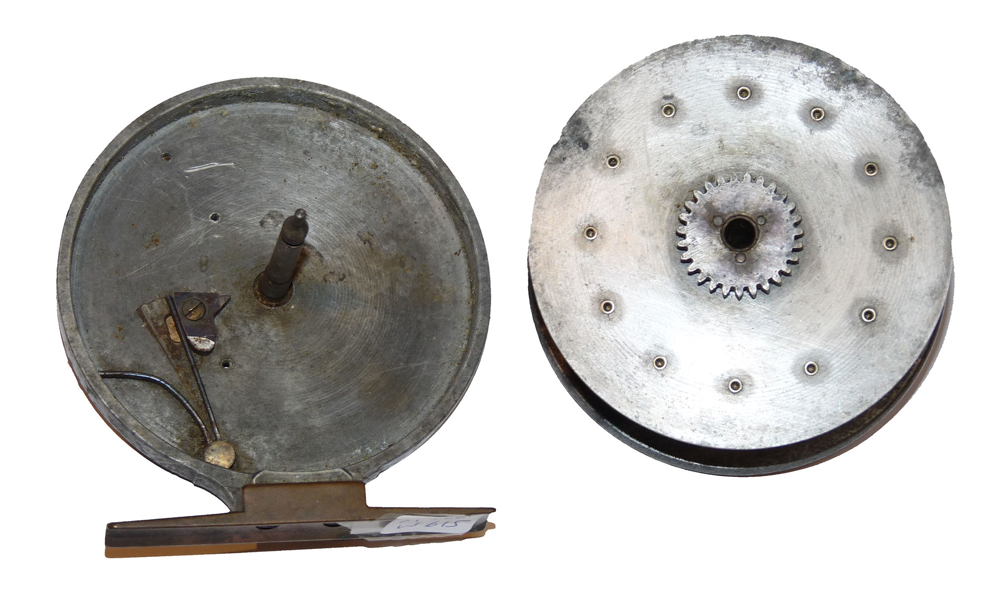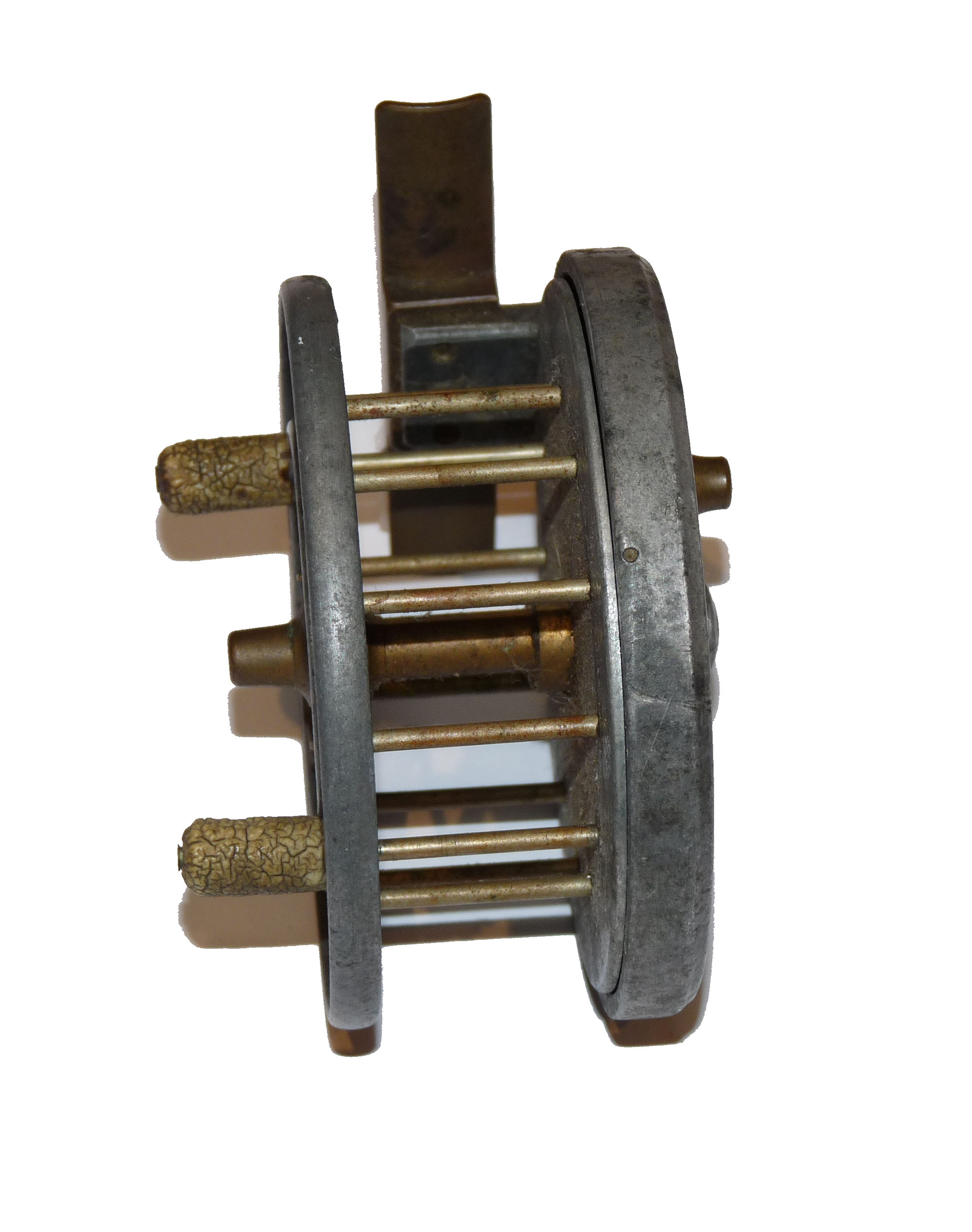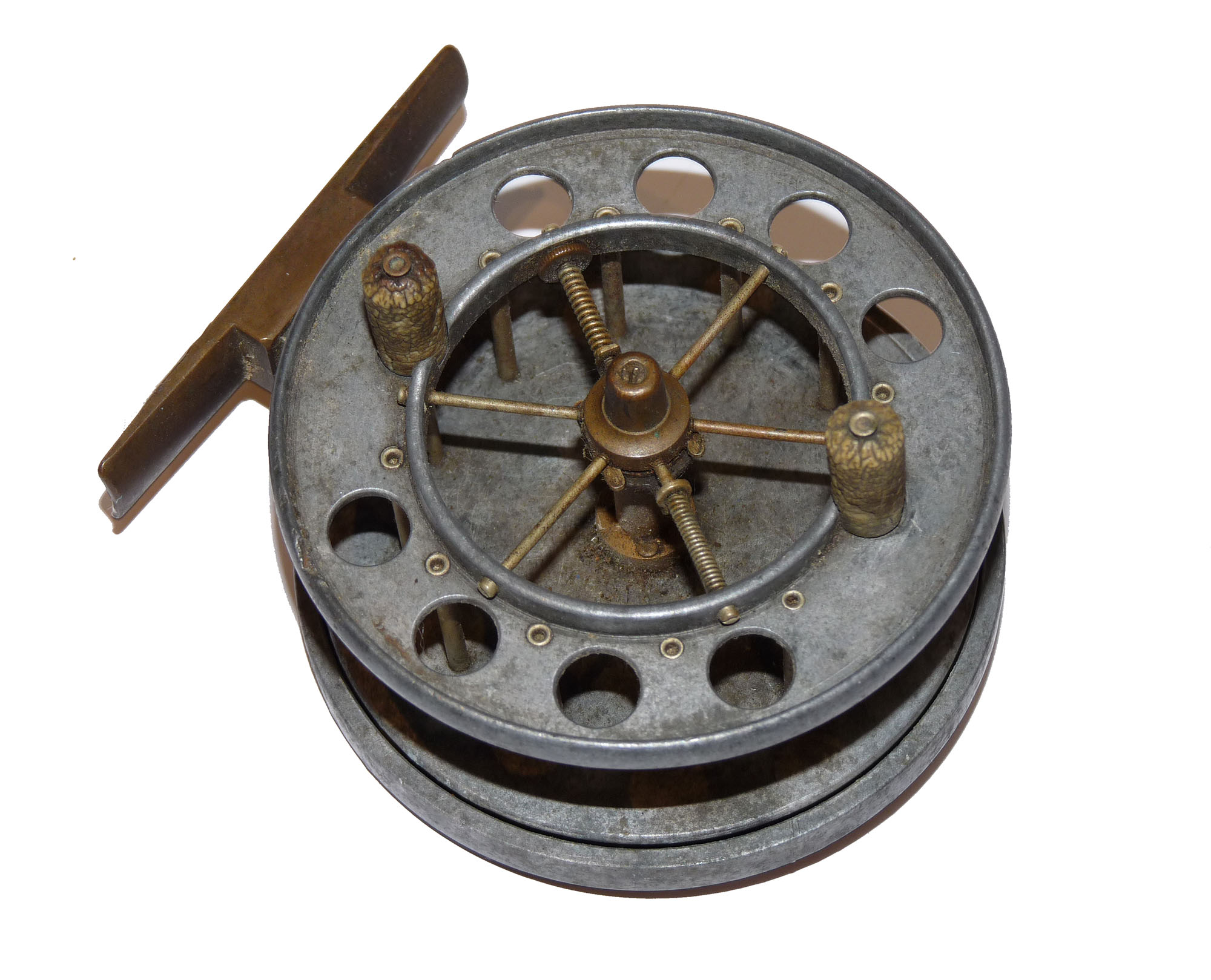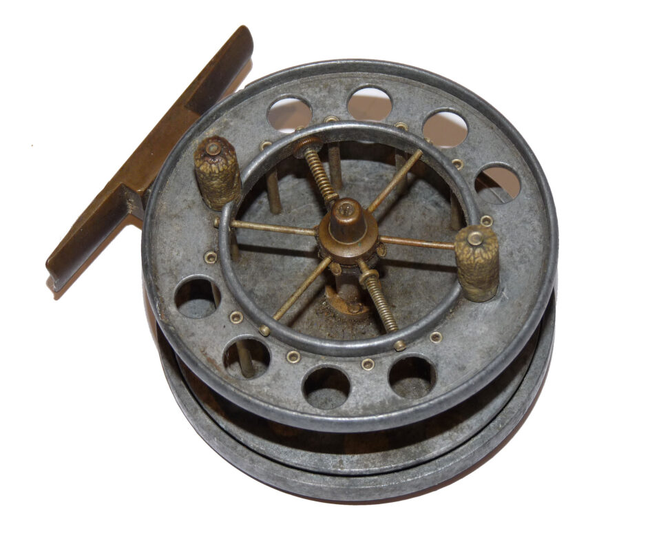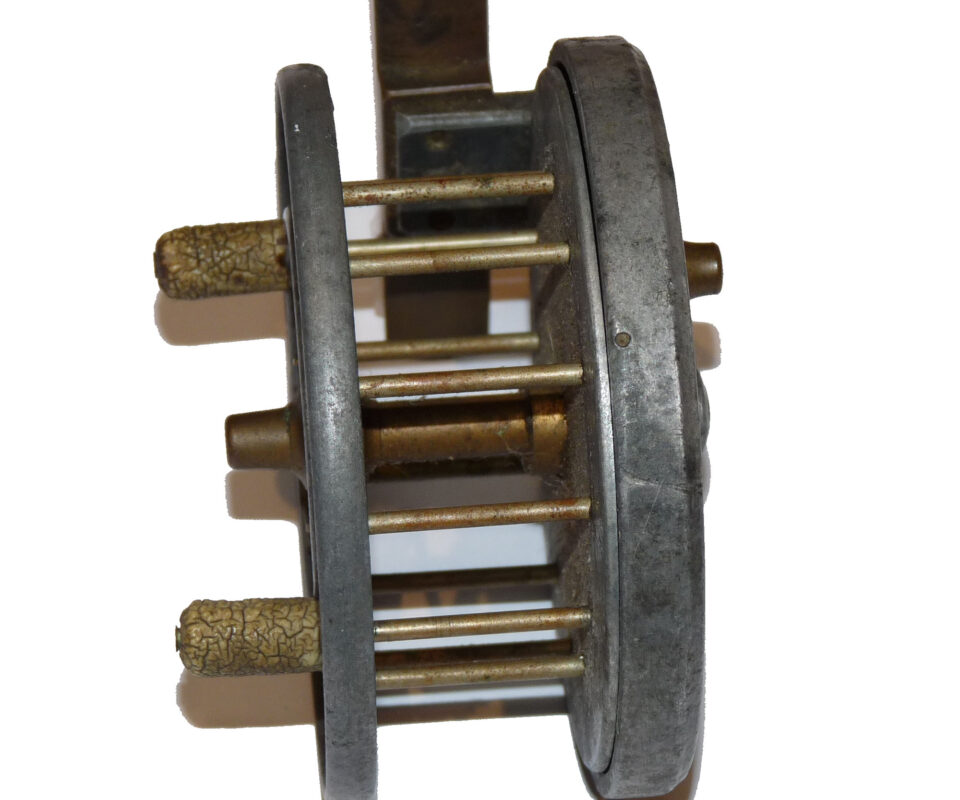Allcock Ventilated Aerial retailed by A Carter 7 Co South Molton, with xylonite handles, 8 holes to face plate, 77mm straight brass foot and brass on/off check button to rear plate. Brass check button slides back into the ‘check on position’ and there is a very small chip in the rim and the spool wont engage. Needs some minor attention. Three minute holes in rear plate.