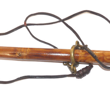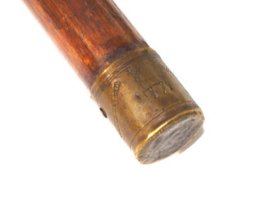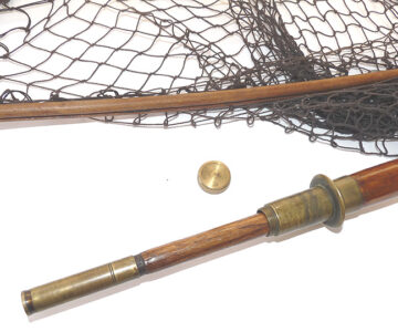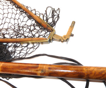 Fabulous Victorian fishing net assembly. 19” wooden arms to brass yoke & spring folding threaded block. Leather cord & early knotted mesh net. The hollow bamboo handle measures 30”, screw cap with extending wood section taking it up to 57” total. The butt cap stamped “S. Allcock & Co., Redditch” with their famous Stag logo. Brass sliding ring and leather carry lanyard complete the setup. A fabulous piece of wall art & rare to find a named example.