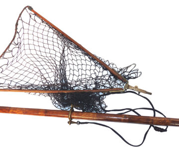Fabulous Victorian fishing net assembly. 19” wooden arms to brass yoke & spring folding threaded block. Leather cord & early knotted mesh net. The hollow bamboo handle measures 30”, screw cap with extending wood section taking it up to 57” total. The butt cap stamped “S. Allcock & Co., Redditch” with their famous Stag logo. Brass sliding ring and leather carry lanyard complete the setup. A fabulous piece of wall art & rare to find a named example.