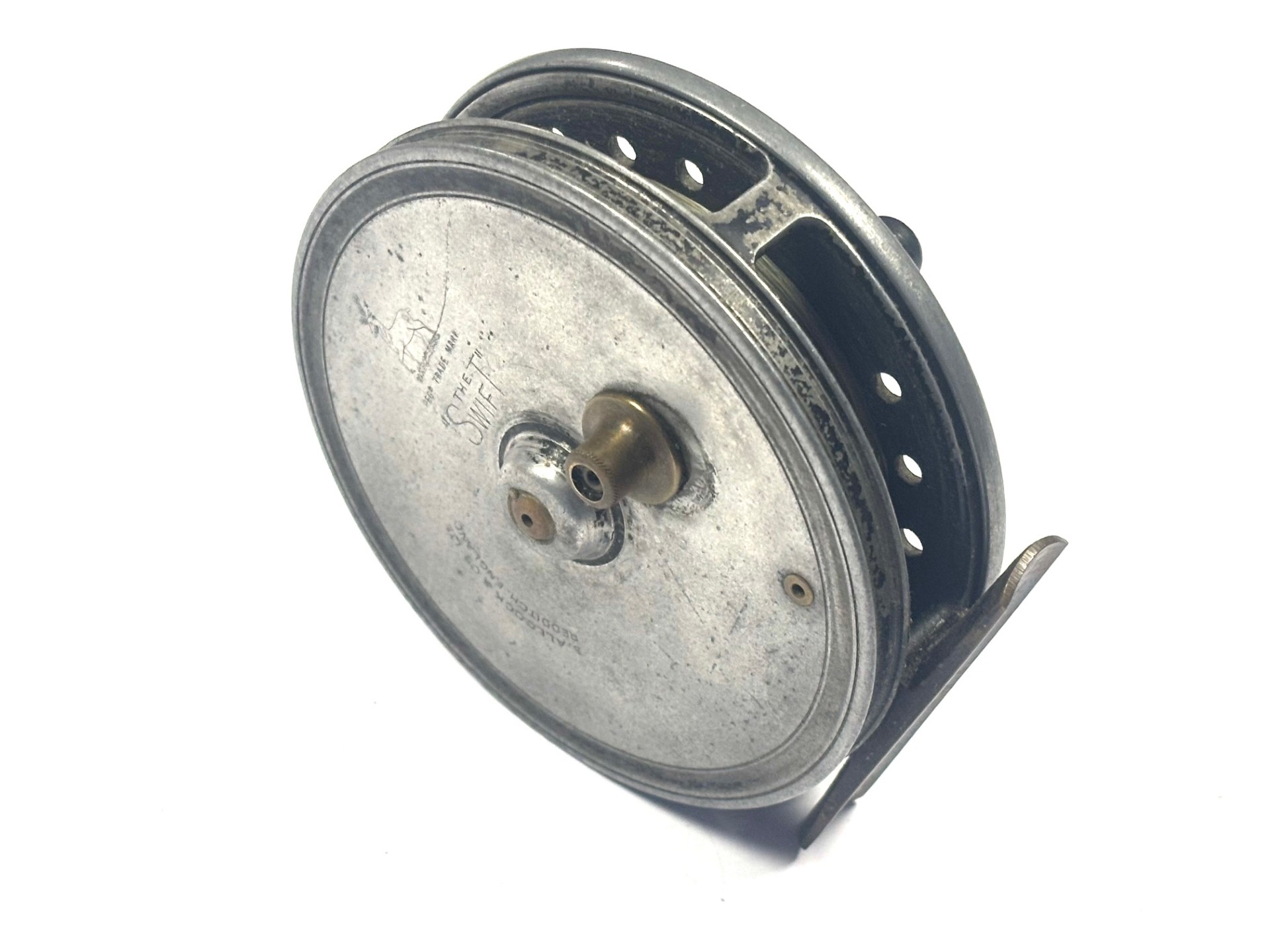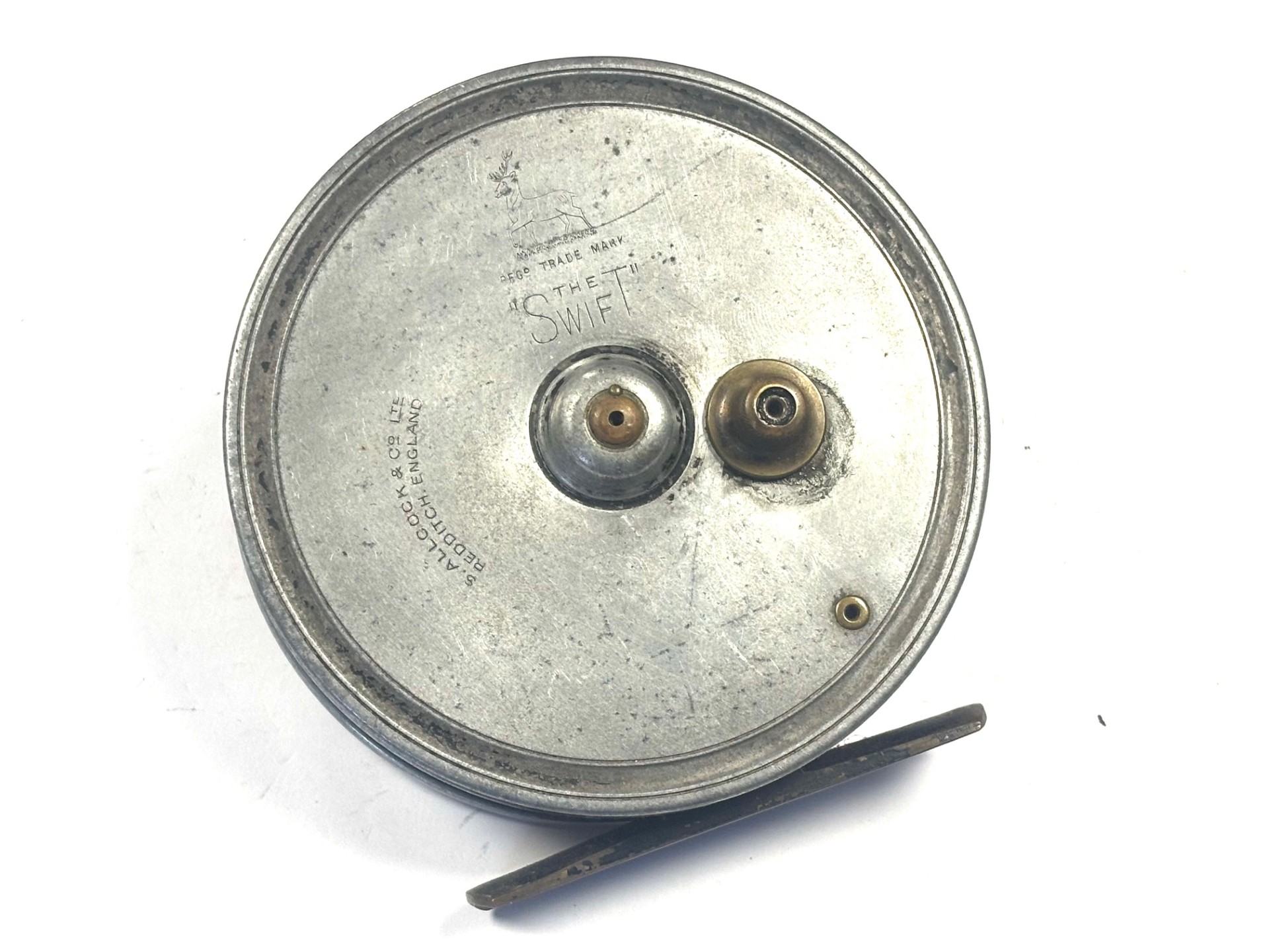 An Allcock’s of Redditch THE SWIFT 4” alloy trotting reel, back plate stamped with Allcock details and THE SWIFT‘ the reel spins with a slight wobble. Ready to use.
