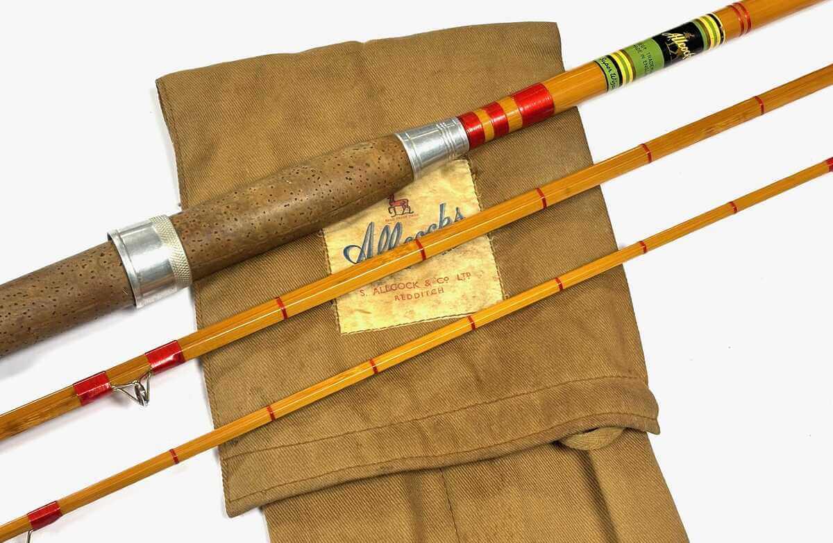 TT opinion: An fine Allcocks Super Wizard 11′ 3 piece rod in fine original condition, whole cane butt with split cane middle & tip. Cherry whipped red agate guides throughout, bronze ferrules with polished alloy stoppers. Complete makers logo transfer, 18.5″ sheet cork handle ( some staining that can be removed) with alloy sliding reel rings & butt cap, screw in black button. Comes in makers original cloth bag.