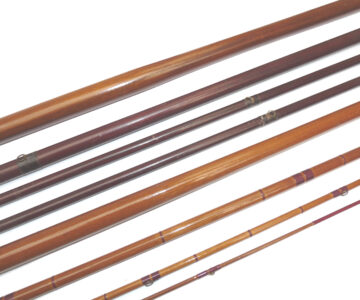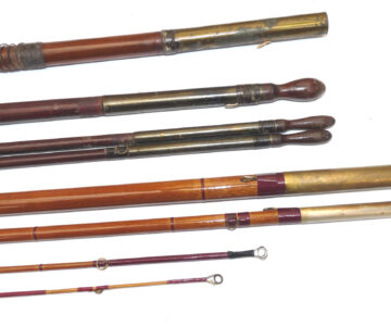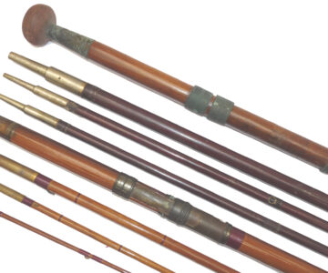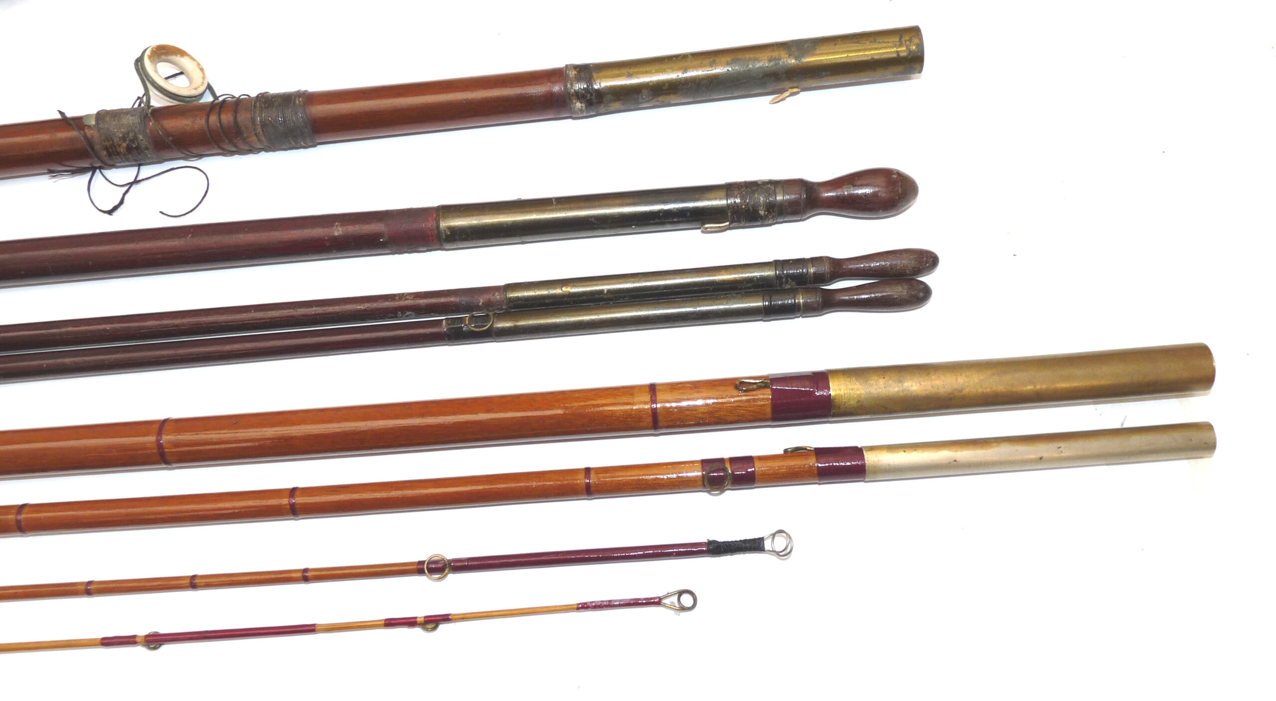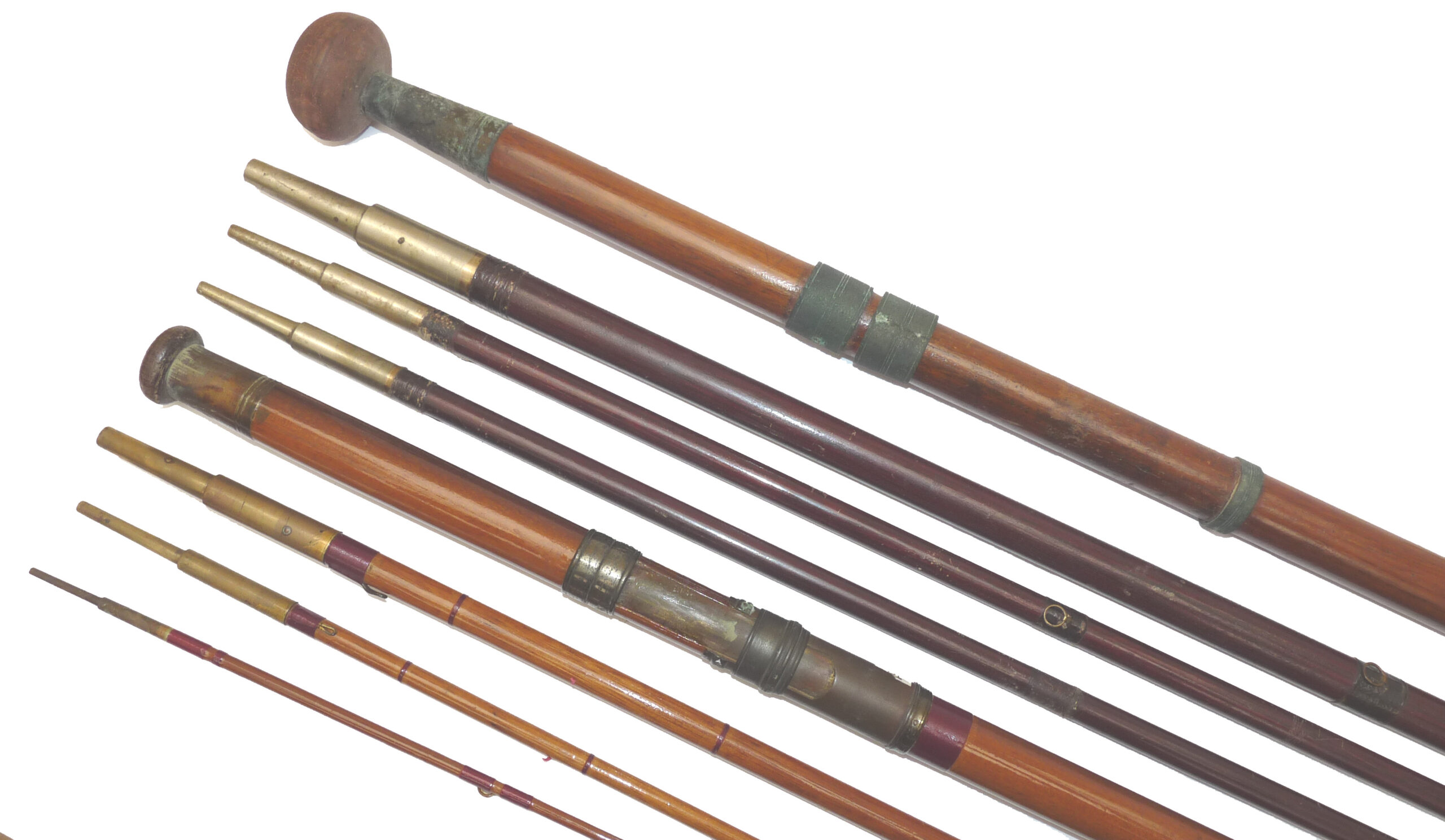Antique greenheart drop ring salmon fly rod dating c 1870/80 with two tops making rods of approx. 13’ and 14. its has been nicely rewhipped years ago and will look fine as a display piece with the brass fittings . plus 3 further greenheart rod parts two mid sections with drop rings and ferrule stoppers plus another odd butt section, must be of value to someone for spares, especially the drop rings guides
