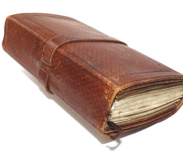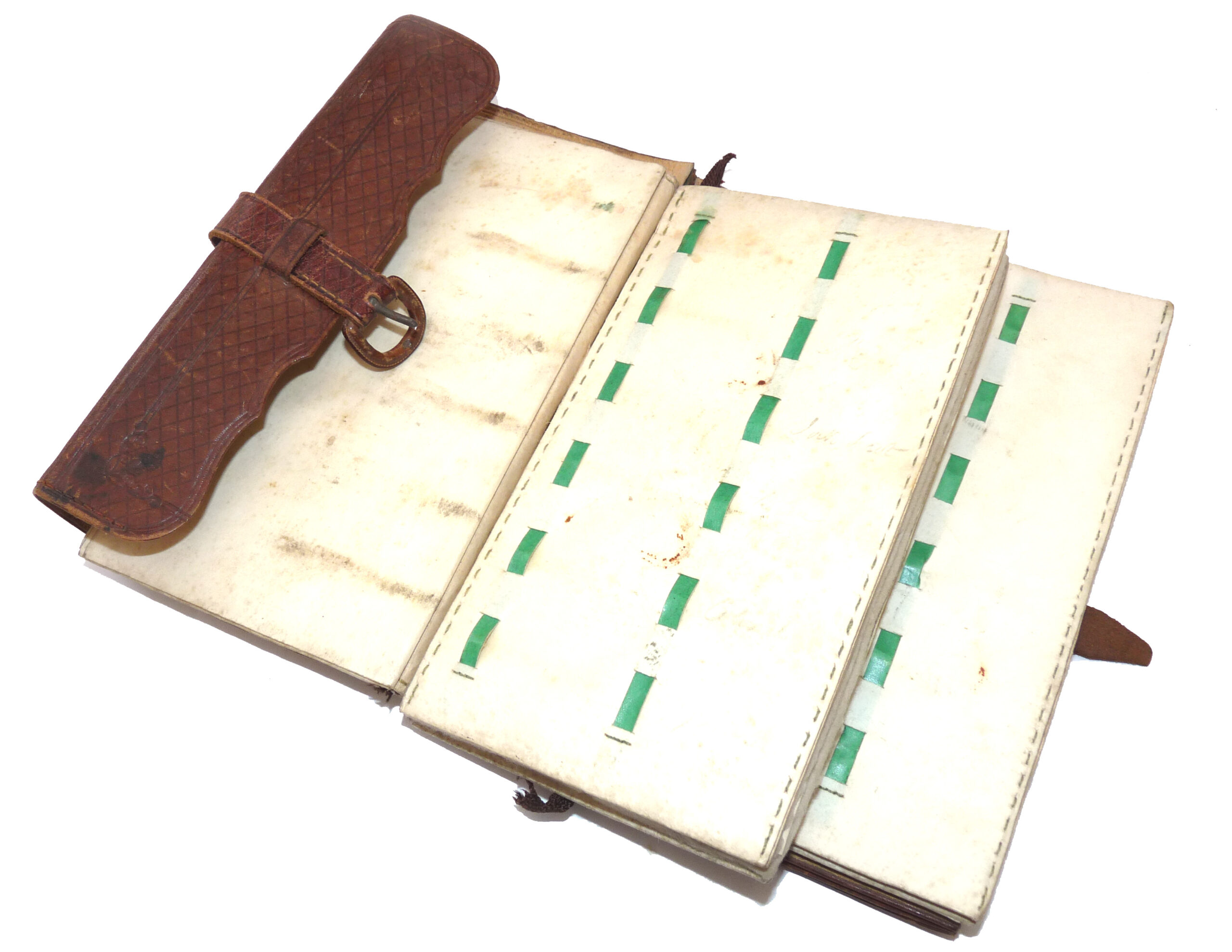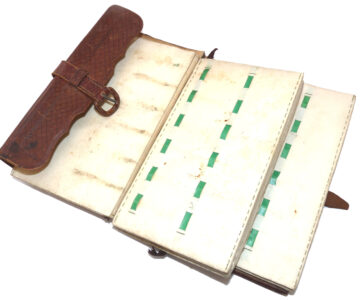 Fine antique leather fly fishing wallet by Bowness & Bowness, Fishing Rod & Tackle Maker, 230 Strand, London from Bell Yard. The address dates it 1851-1882. Brown tooled highly decorated wallet measuring 7.5” x 4” x 2”, original strap & buckle. Three multi-page velum & felt pages with pockets, plus green fly retainer strips. Fine collectors’ wallet.