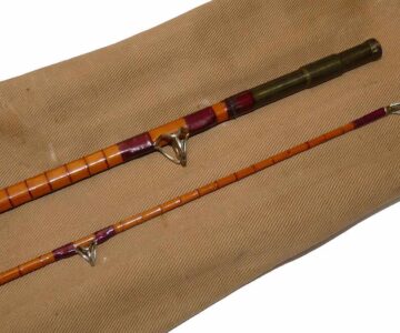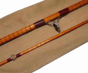 TT opinion: A good condition B James &son London Richard Walker Mk4 Avon split cane rod to fish or collect. 10′ 2 piece, burgundy close whipped with a nice tight bronze ferrule, red agate lined butt and tip rings. 24″ cork handle with sliding alloy reel rings, and butt cap, red rubber button, the rod is good,no visible faults, overall a very good clean example. Comes in non original cloth bag