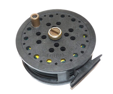 Bob Church Northampton Line Shooter large arbor trout fly reel in full working order. 4” diameter x 40mm across frame, a light weigh reel coming in a 200grams, Single handle, front drag adjuster and backplate on off check button. 55mm foot blade fitting glass and carbon rods, great distance casting reel with a fast good retrieve. Designed on the Northampton reservoirs Bob used to frequent. Comes with Scientific Anglers Wet Cel ST-9-S line and backing ready to fish.