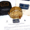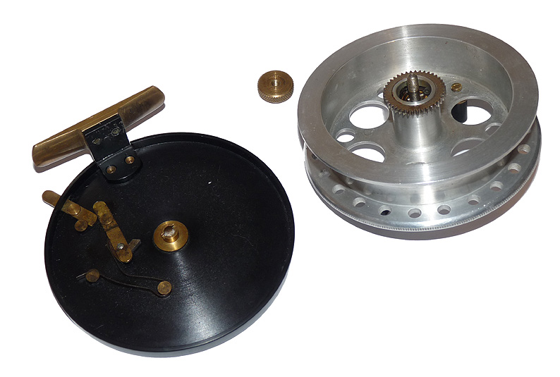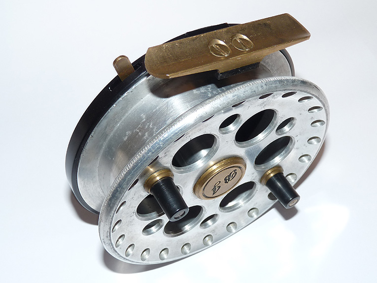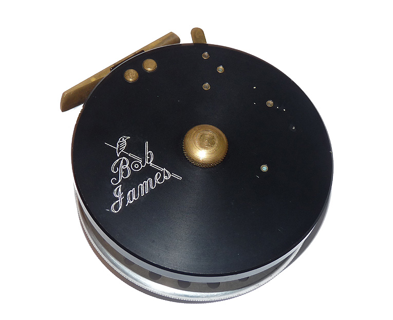 Bob James 4.5” alloy centrepin trotting reel, in fine used condition. Polished alloy ventilated drum, twin round handles, milled edge to front flange, shallow solid drum core, satin black backplate with Bob James logo. 68mm smooth brass foot with side lever check, reel runs forever, is straight good example, suited to carp, chub & barbel fishing.