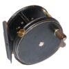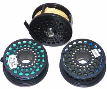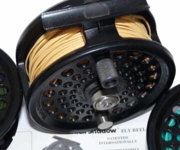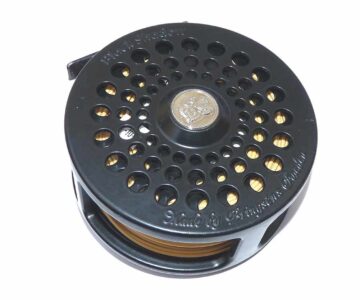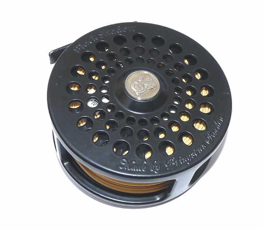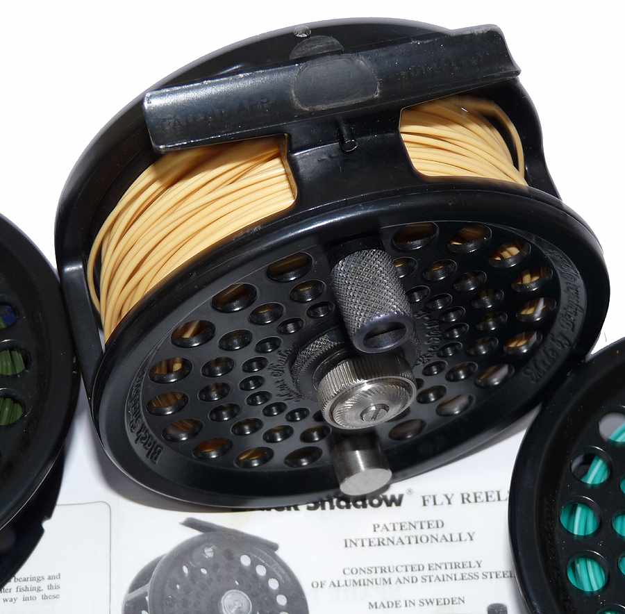 A Bringsens of Sweden Black Shadow alloy salmon fly reel in as new condition, Superb quality reel, 4-3/8″ diameter and 50mm across the frame. Crosshatched alloy handle with counterbalance gives a smooth running reel, ball-bearing spindle core, and cork drag with the adjuster to the centre front of the spool. The reel can be fished with left or right-hand wind. A nifty little line clip is factory fitted alongside the foot blade. The reel has seen very little use and retains virtually all original black finish. It comes with 2 spare spools filled with Wet Cel Dt-110s, DT-10-WC2 and DT10F lines and makers instruction leaflet.
