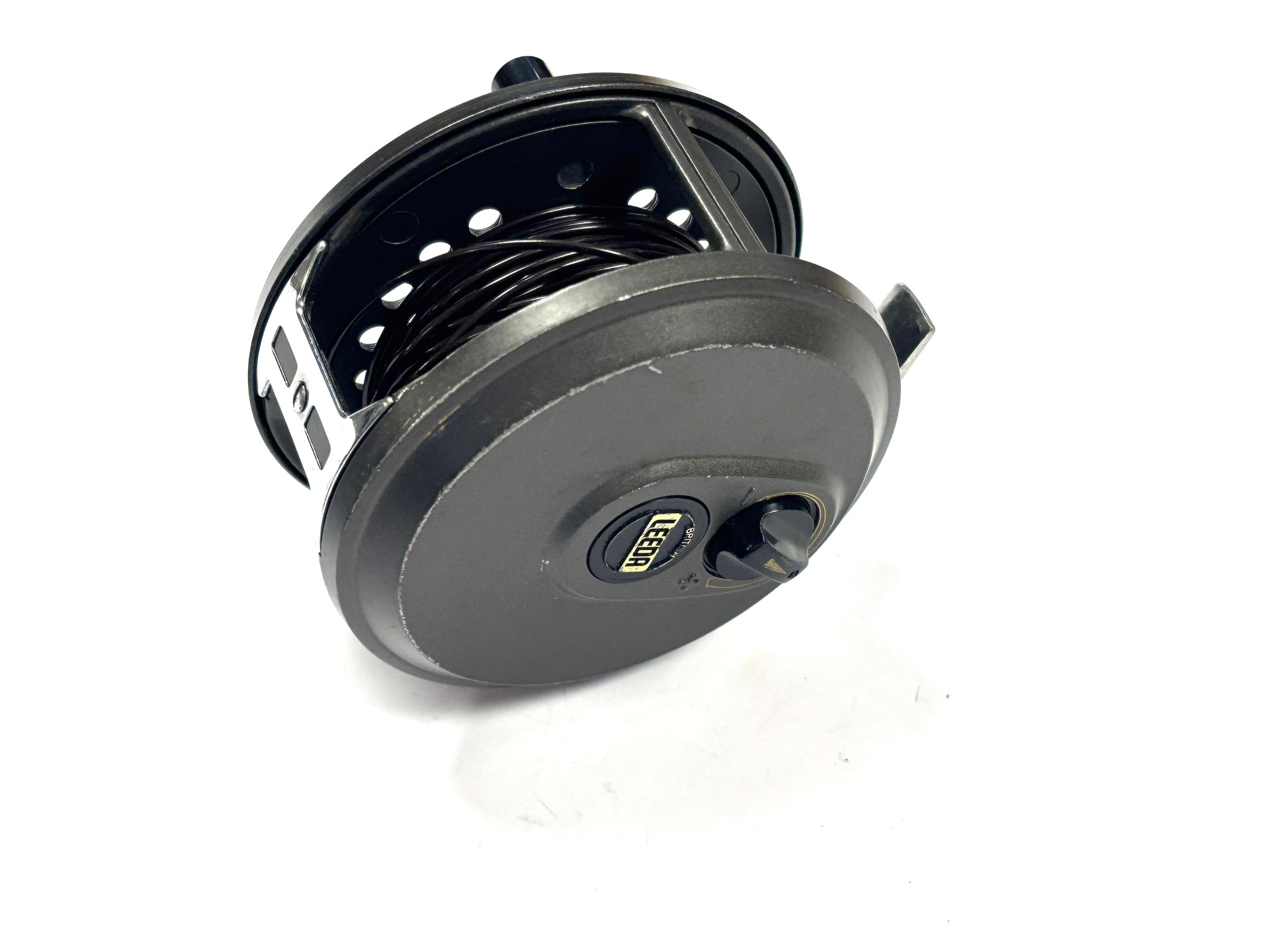 British Fly reels Magnum 200D disc drag salmon fly reel, in very good used condition, 4” diameter, 50mm wide spool, quick release drum, twin U shaped line guide for left or right hand wind, 66mm smooth alloy foot, backplate tension adjuster, silky smooth low noise drag, high-quality fly reel for salmon or saltwater fishing, comes with spare spools and unmarked lines.