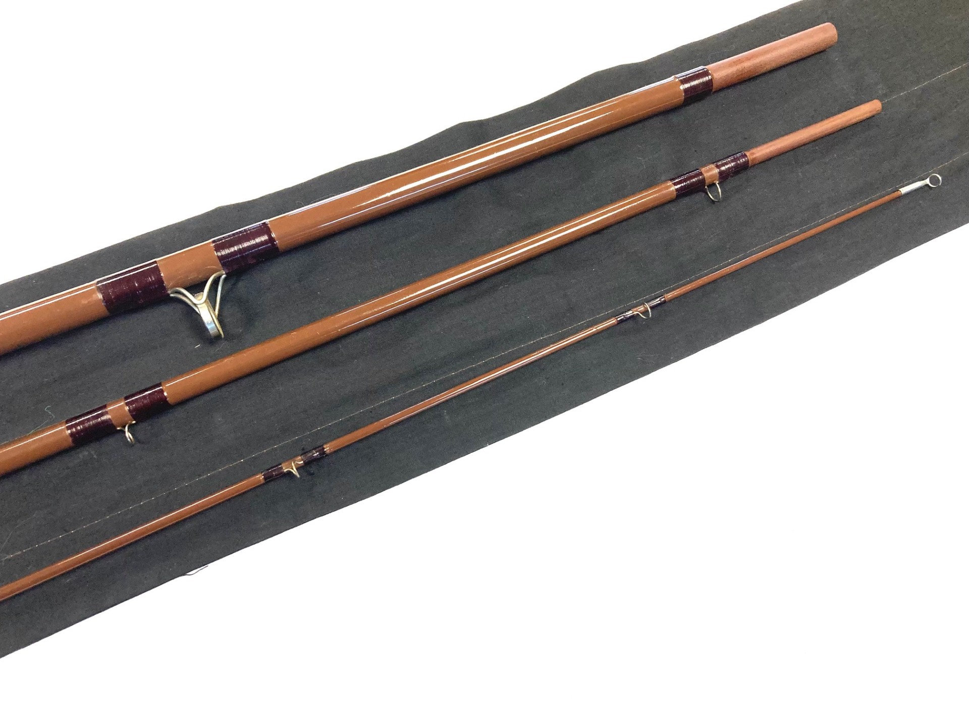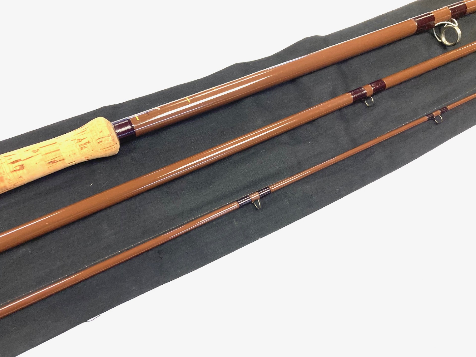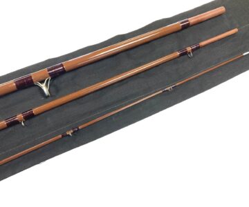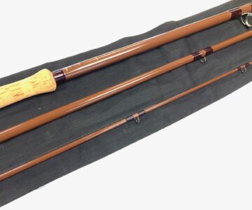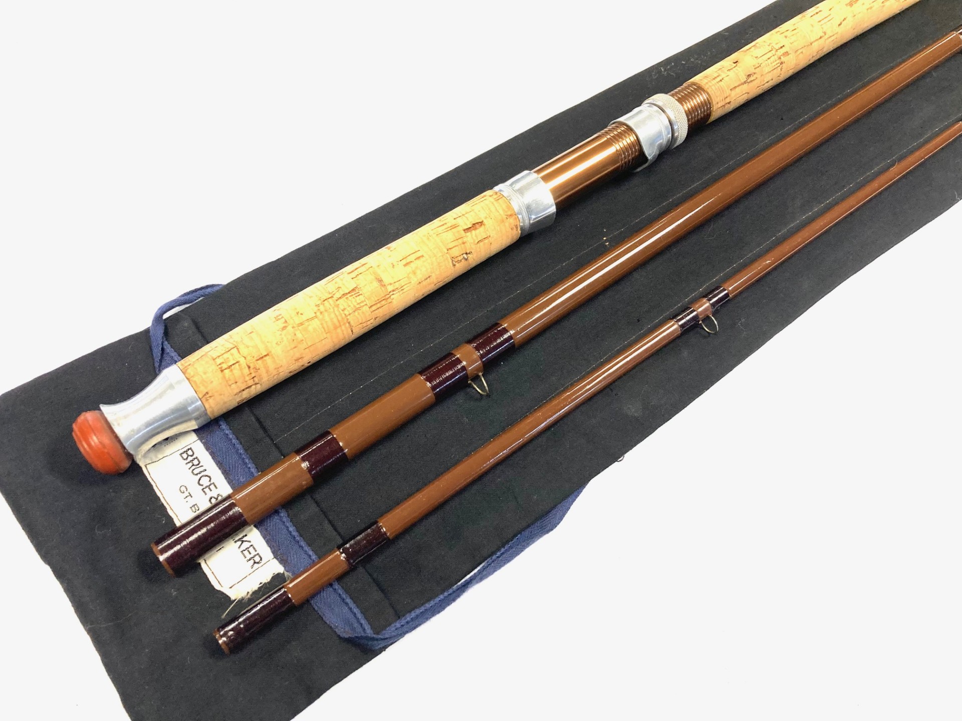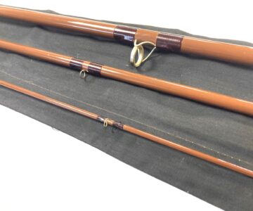 TT opinion: Bruce & Walker Highlander 12’ 3 piece hollow glass fly rod, line rate #5/6, dark brown whipped snake guides. 24” cork handle with bronze anodised screw winch fitting complete with clean makers cloth bag. Ready to fish!