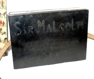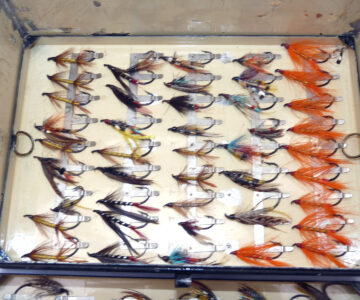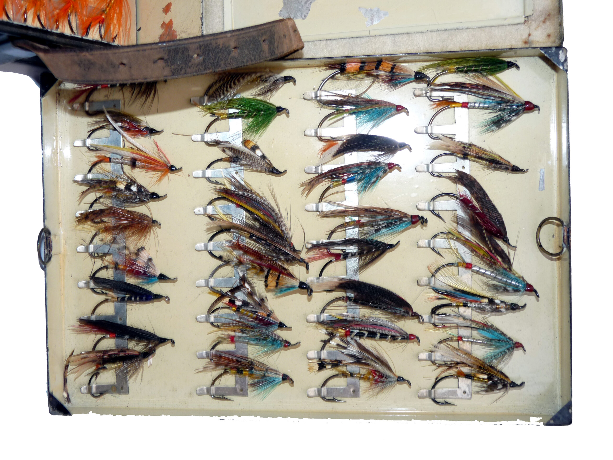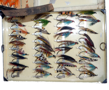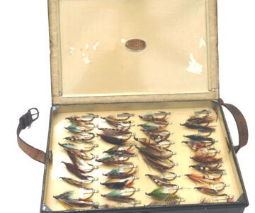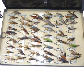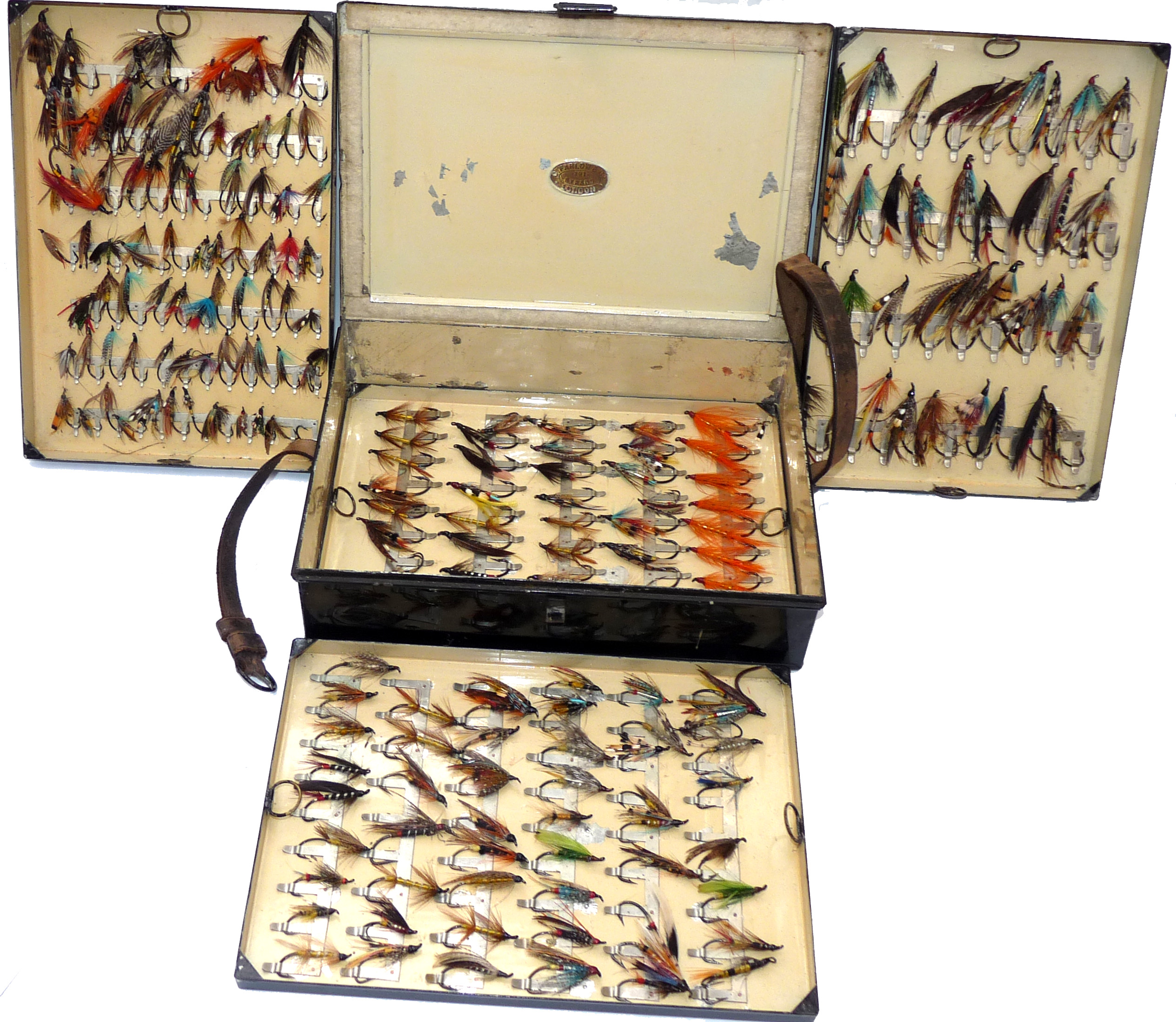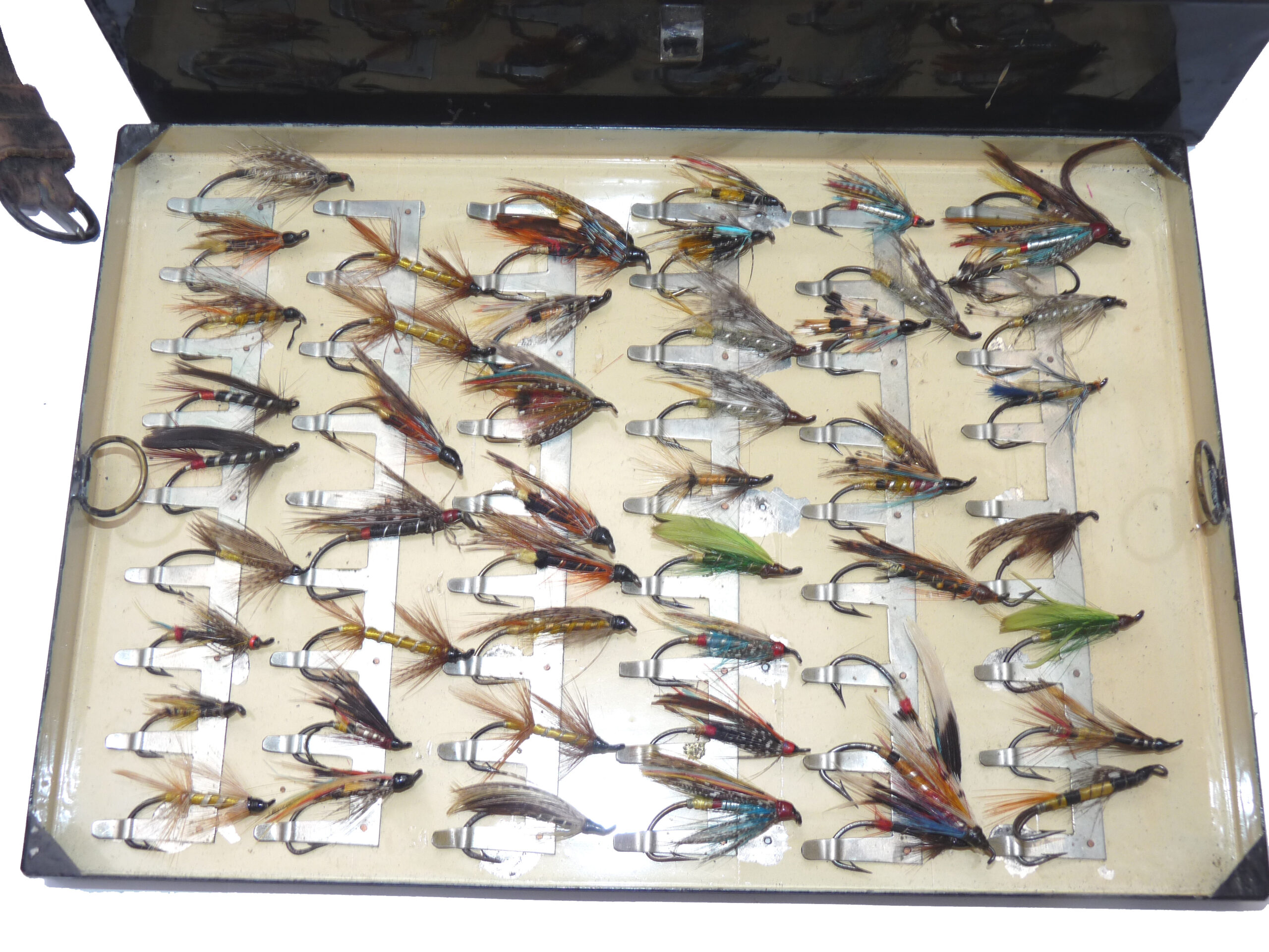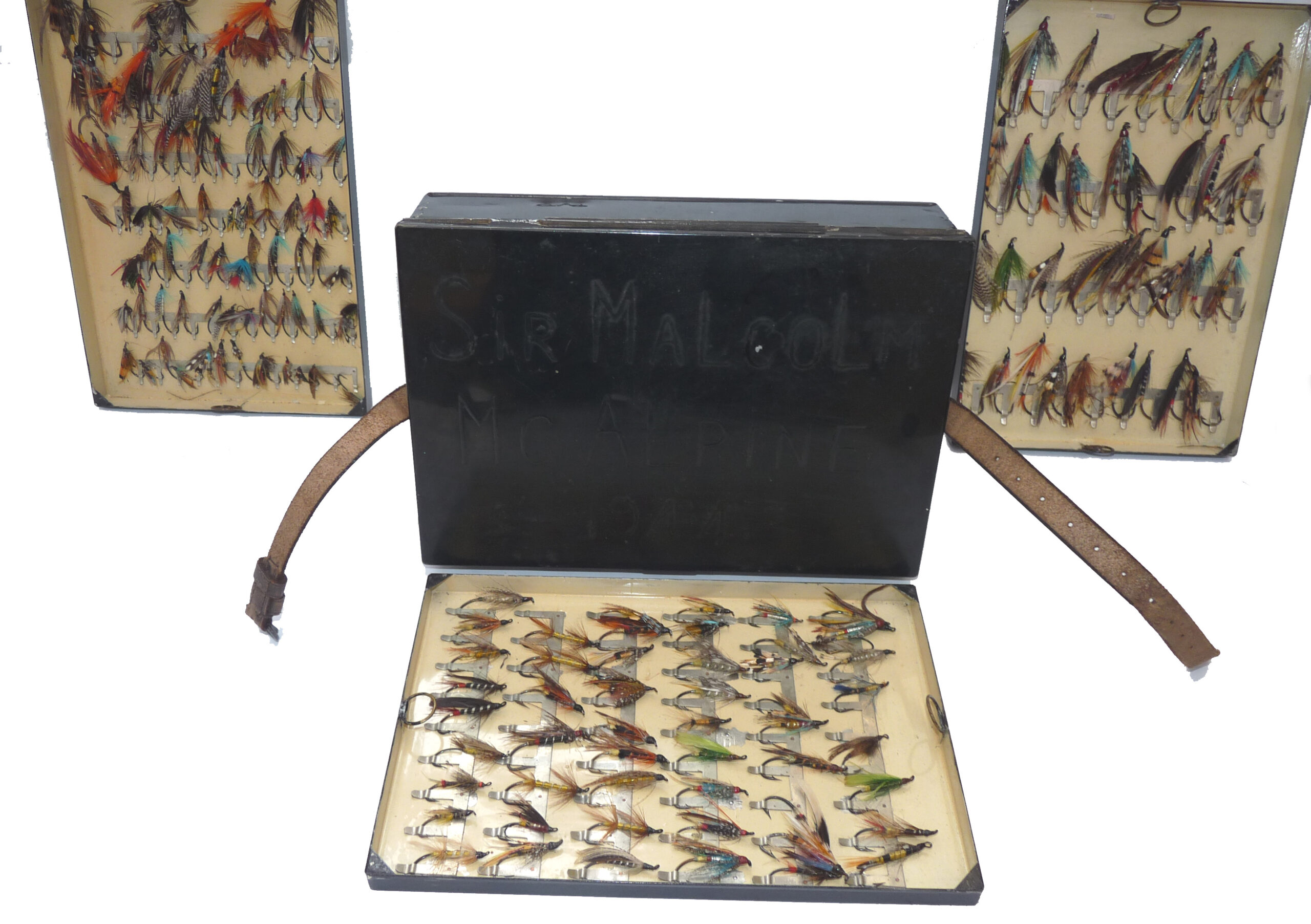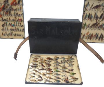 Fine C. Farlow & Co. 191 Strand, London, black japanned reservoir box, the lid marked “Sir Malcolm McAlpine, 1944.” The box measures 10” x 7” x 2.5”. Hinged lid with clasp & external leather strap, opens to reveal a cream lacquer interior & Farlow brass label. The four lift-out trays are filled with a collection of vintage salmon flies up to 2” long, all steel-eyed. Flies are of various patterns including a few double hook models. This is a fine historical piece for any collector.