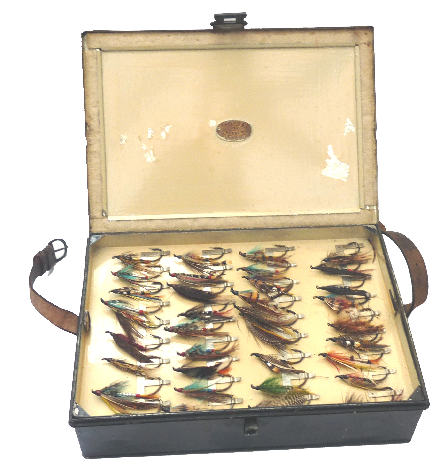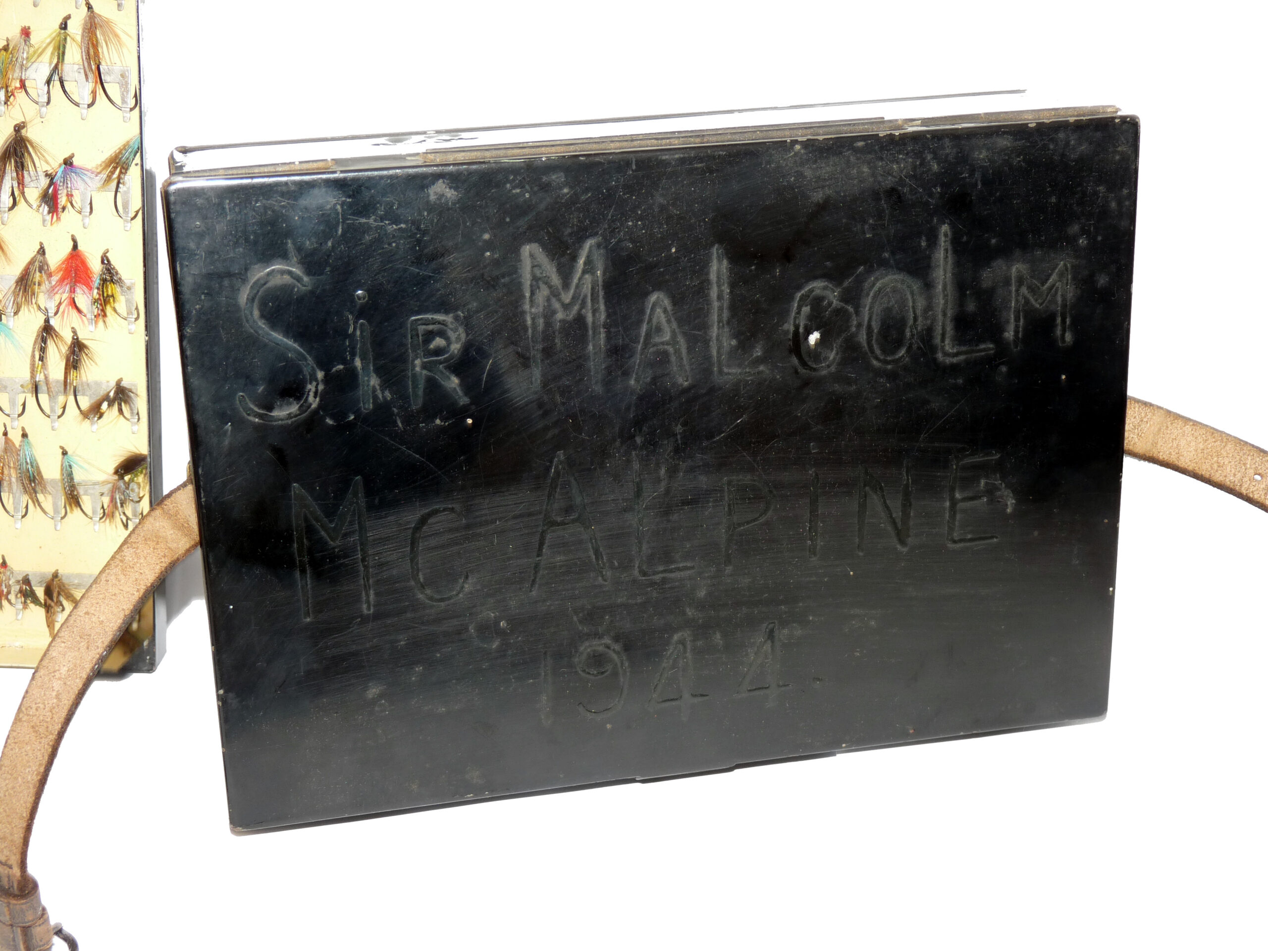 C Farlow black japanned fly box & flies Sir Malcolm McAlpine
