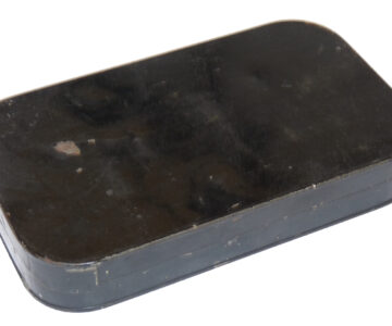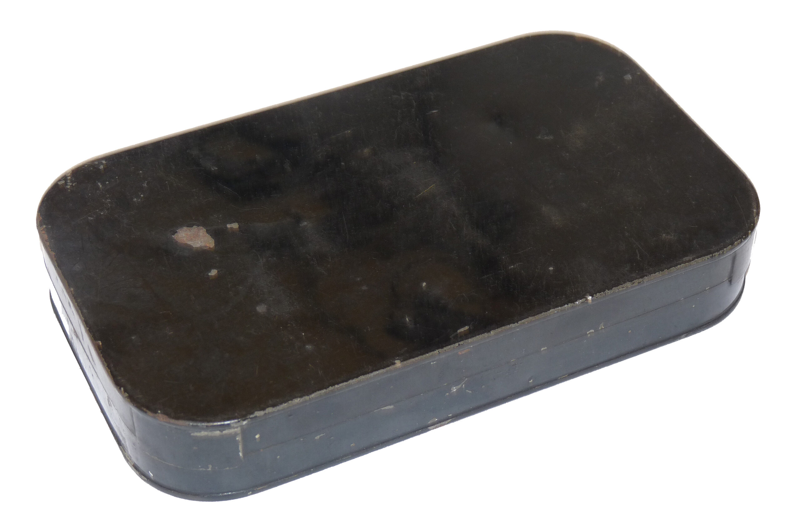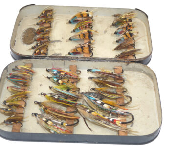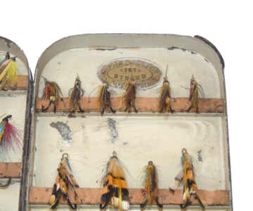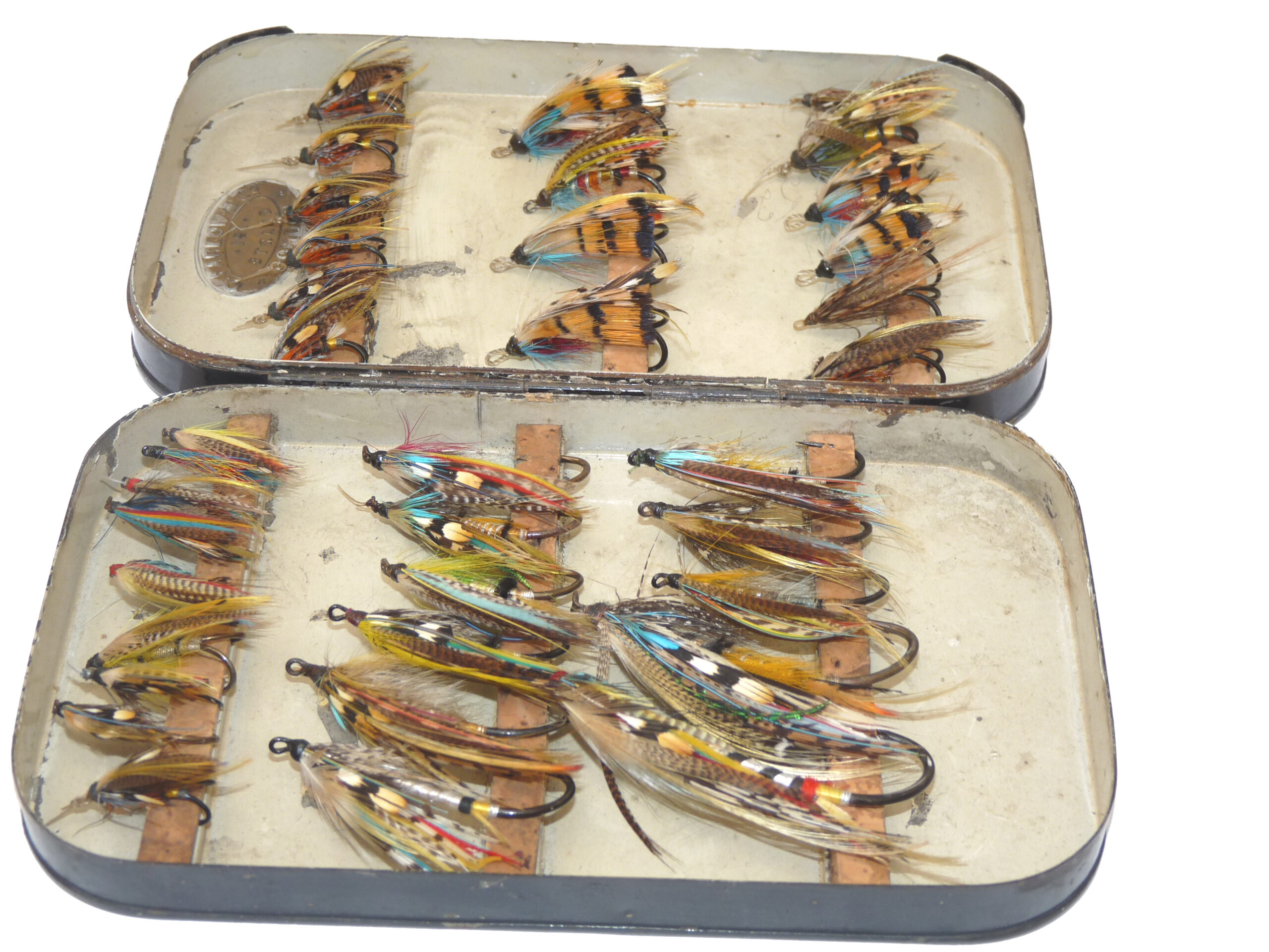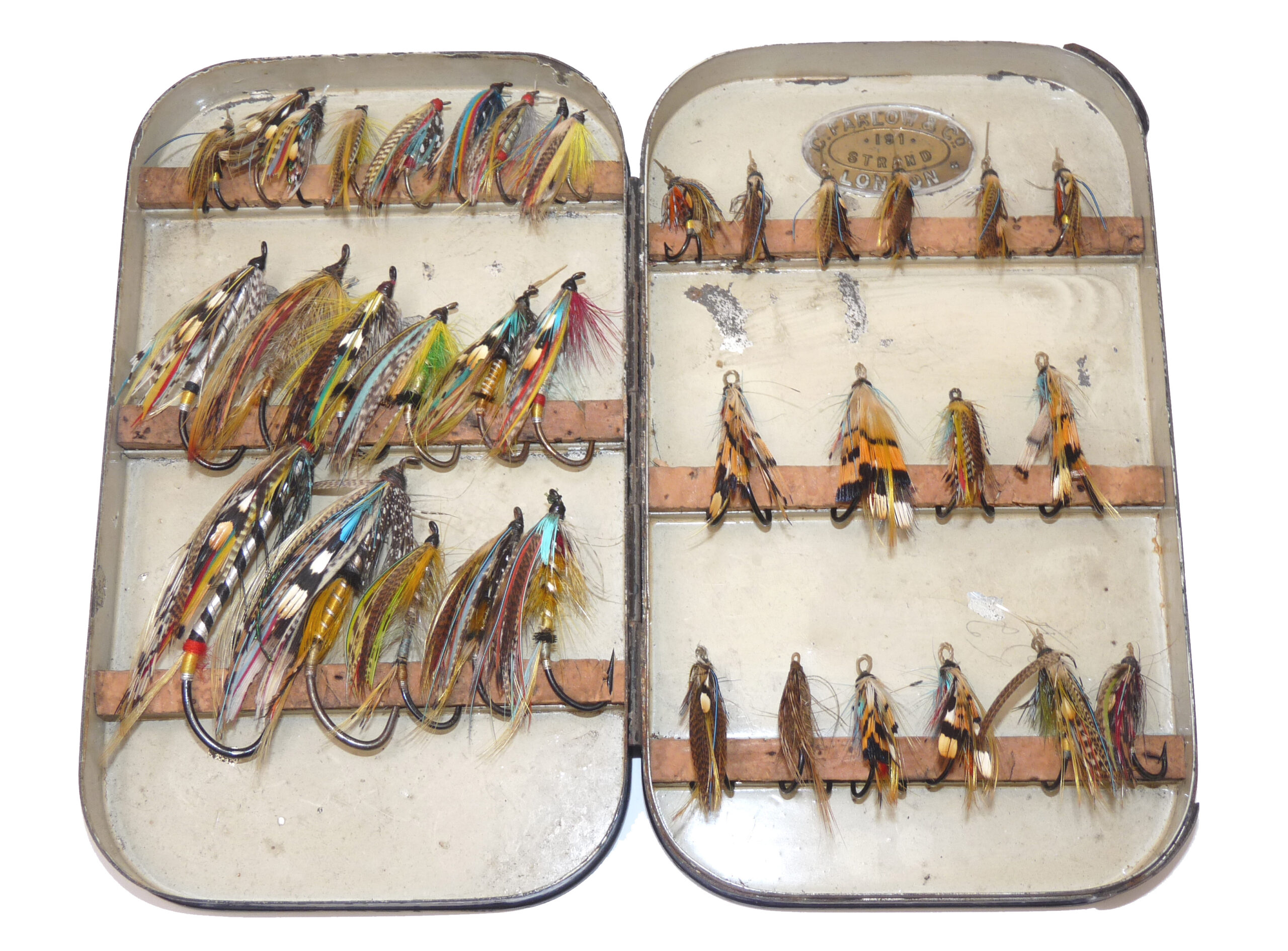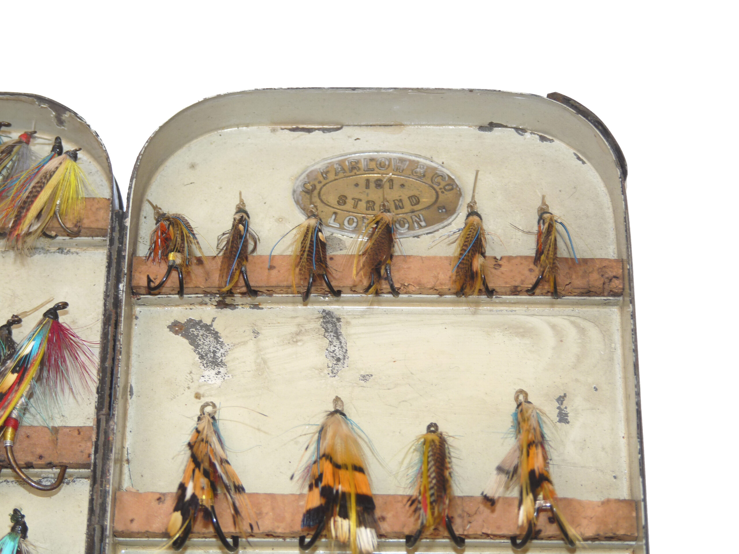 C Farlow & Co., 191 Strand, London antique black japanned pocket fly box, measuring 6” x 3.75”, cream lacquer interior with brass maker’s logo plate. 6 cork strips holding a collection of antique salmon flies comprising 16 gut eyed doubles, up to 1.25” and a further 19 mainly single hook traditional flies, up to 2.25”, great display piece.