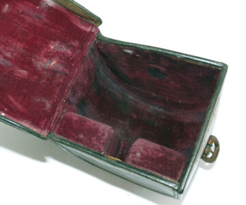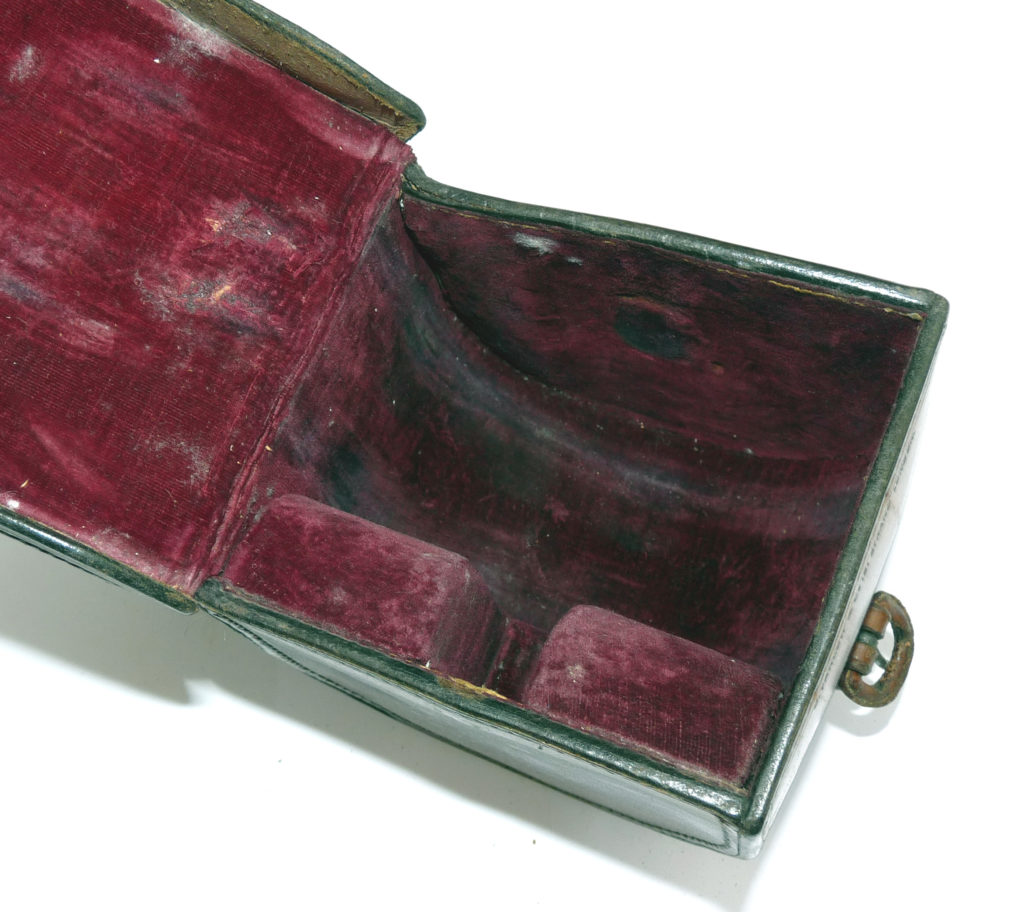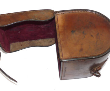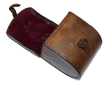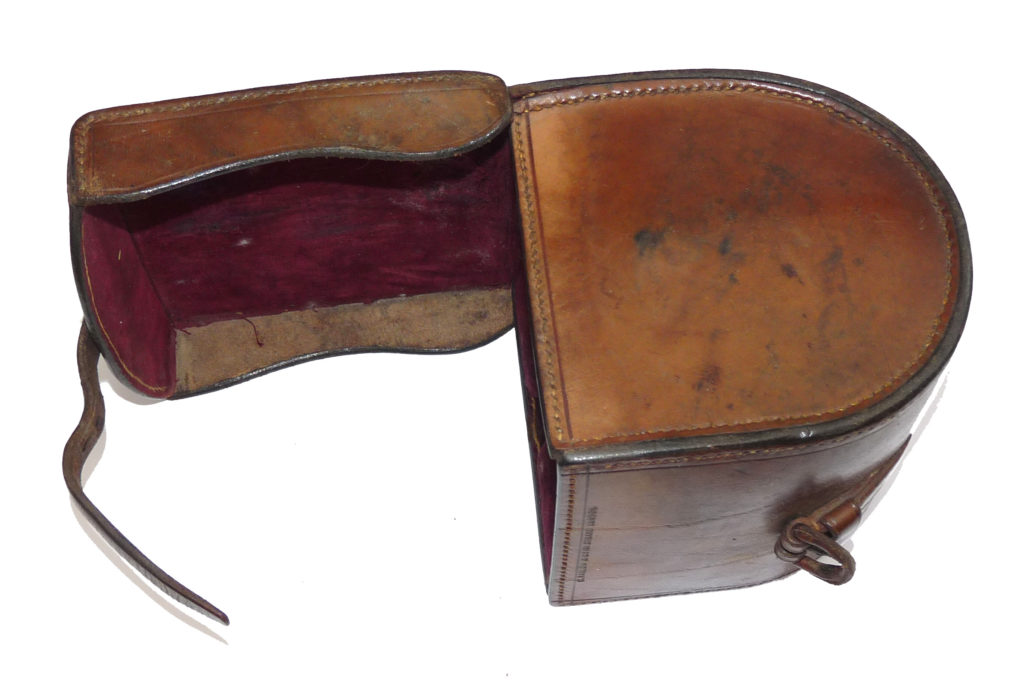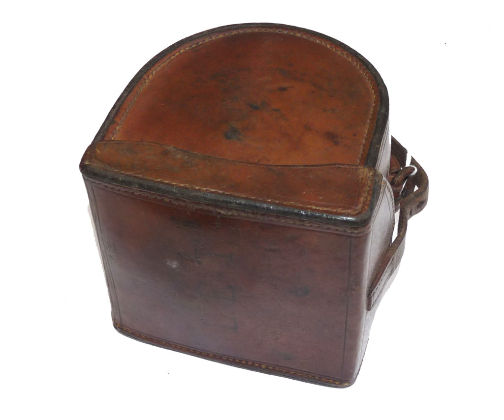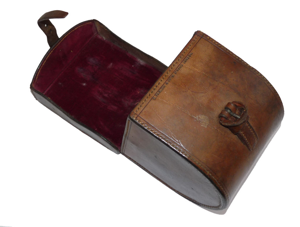 C Farlow & Co Ltd.191 Strand London Wide Block leather D-shaped reel case. 2 3/4″ wide inside by 4 1/4″ with an additional handle slot. Red baize interior with some wear. The leather strap and buckle are intact and in good overall condition. Strong reel case, L.E.T. embossed to the lid.
