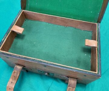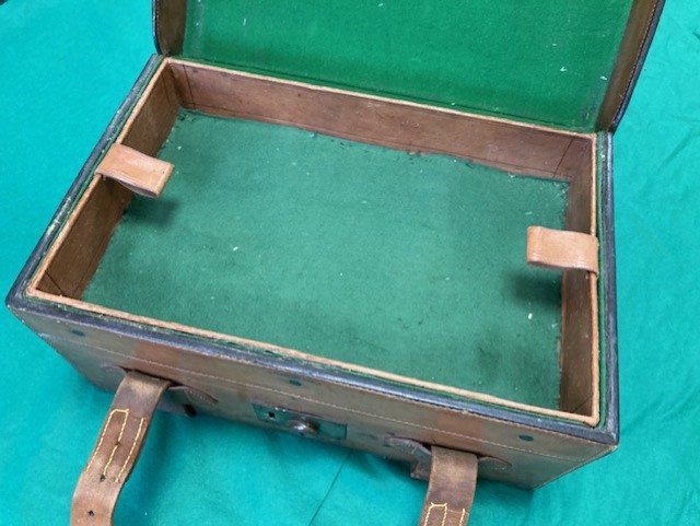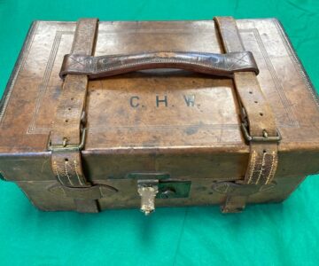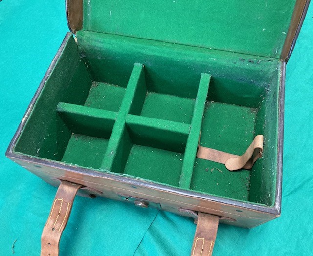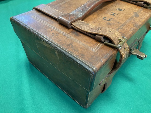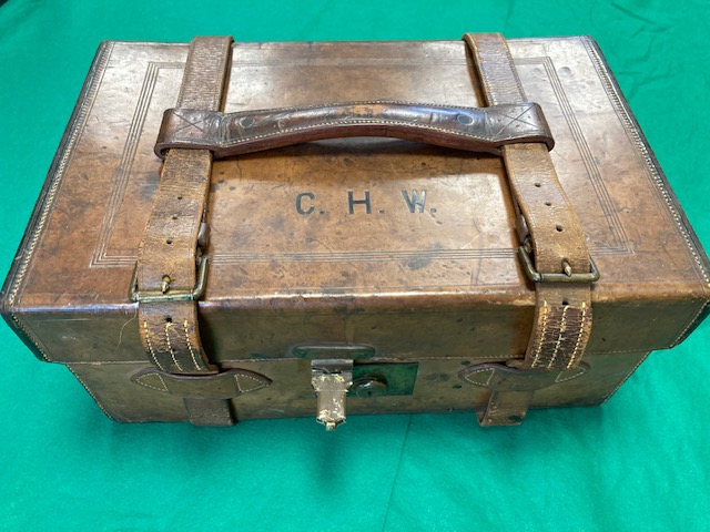 TT opinion: A fine C Farlow & Co rectangular leather salmon tackle hold all with green baize lined interior, fitted lift-out tackle tray and compartmentalised base, brass hasp lock ( key missing) and wrap around carry handle with twin locking straps. Stamped with makers details and lid stamped CHW. A fantastic piece of Angling history.
