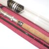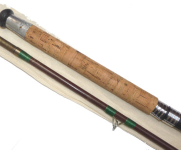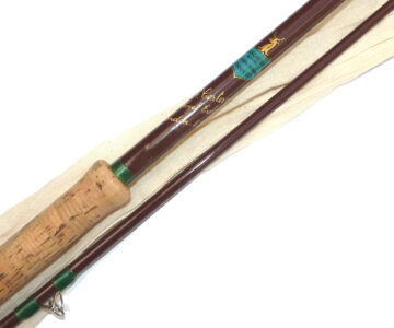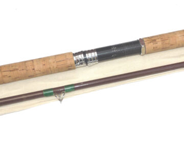 Carter & Son, Royal Exchange, London 8’9”, 2 piece hollow fibreglass spinning rod in fine condition, green whipped low bridge guides, bronze suction staggered ferrule model butt shorter than tip to get the action correct, 8’9”, 2 piece, ideal for spinning, stalking, good vintage rod, c1960’s, comes in cloth bag.
