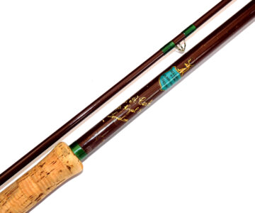 Carter & Son, Royal Exchange, London 8’9”, 2 piece hollow fibreglass spinning rod in fine condition, green whipped low bridge guides, bronze suction staggered ferrule model butt shorter than tip to get the action correct, 8’9”, 2 piece, ideal for spinning, stalking, good vintage rod, c1960’s, comes in cloth bag.