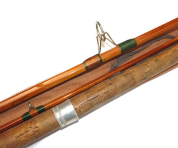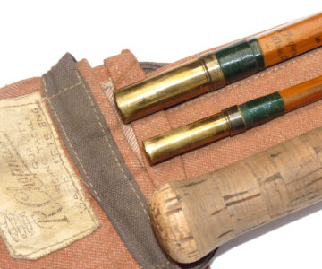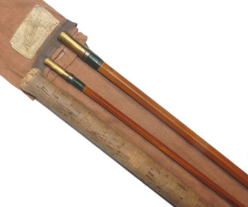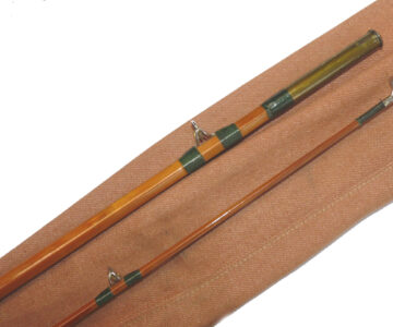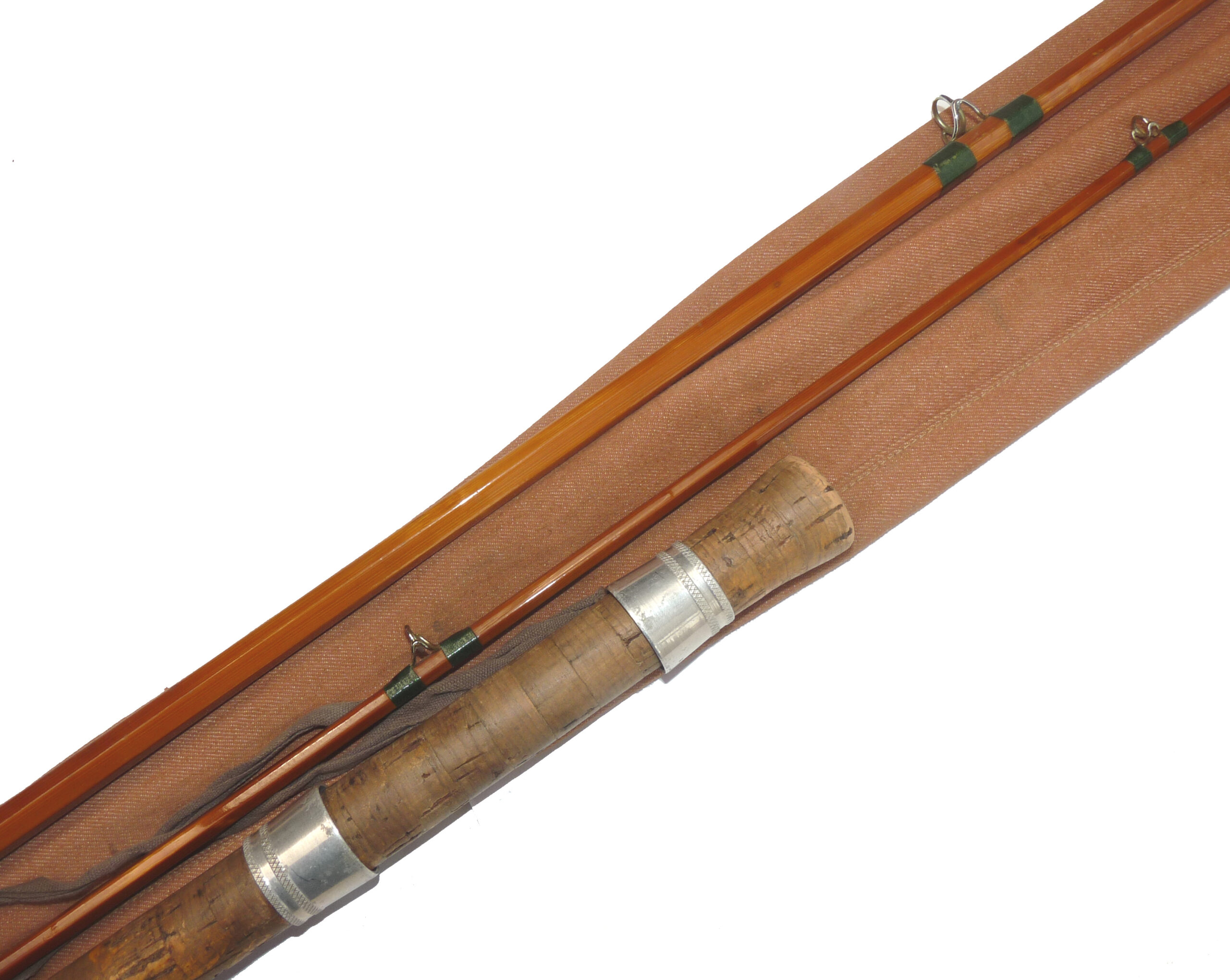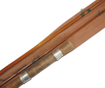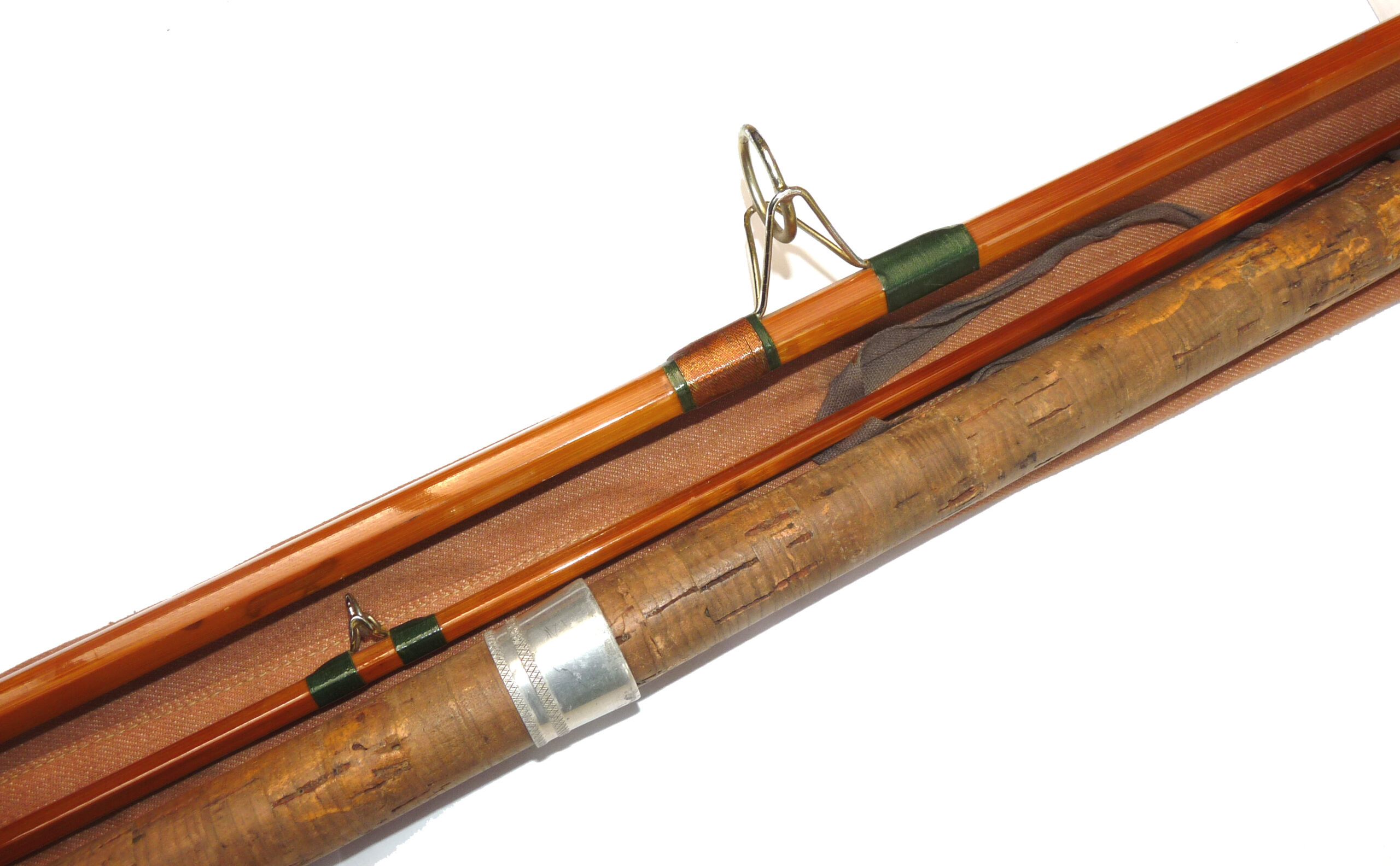 Chapman of Ware 550, 10’ 2-piece split cane Avon or carp rod, in good original condition, green whipped guides, bronze ferrule, 27” detachable cork handle with light alloy reel rings, the rod has a set in the top section, perhaps 2” off straight on its entire length, very fishable, all original, comes in maker’s fitted cloth bag.