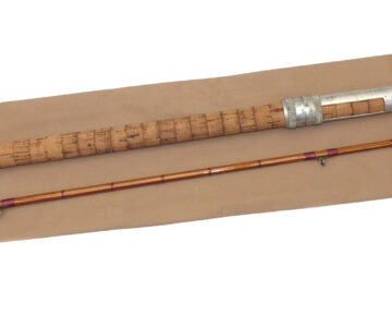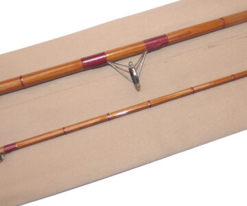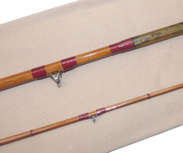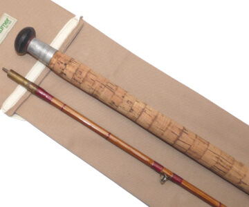 Classic 10’ 2 piece (Avon Four Arnold) split cane rod, in good fishable condition, burgundy whipped lined red agate guides throughout, bronze ferrule, 30” cork handle with sliding alloy tube style reel fitting, the cane is straight, ferrule tight, similar in power to a James Mk1V, ideal for carp, barbel, even salmon fishing. Comes with a high-quality Thomas Turner new cloth rod bag.
