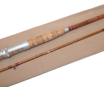 Classic 10’ 2 piece (Avon Four Arnold) split cane rod, in good fishable condition, burgundy whipped lined red agate guides throughout, bronze ferrule, 30” cork handle with sliding alloy tube style reel fitting, the cane is straight, ferrule tight, similar in power to a James Mk1V, ideal for carp, barbel, even salmon fishing. Comes with a high-quality Thomas Turner new cloth rod bag.