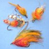 14 antique large gut eyed salmon flies stitched onto grey card, hook sizes 1/0 to 7/0
