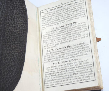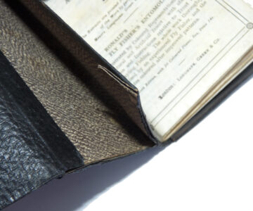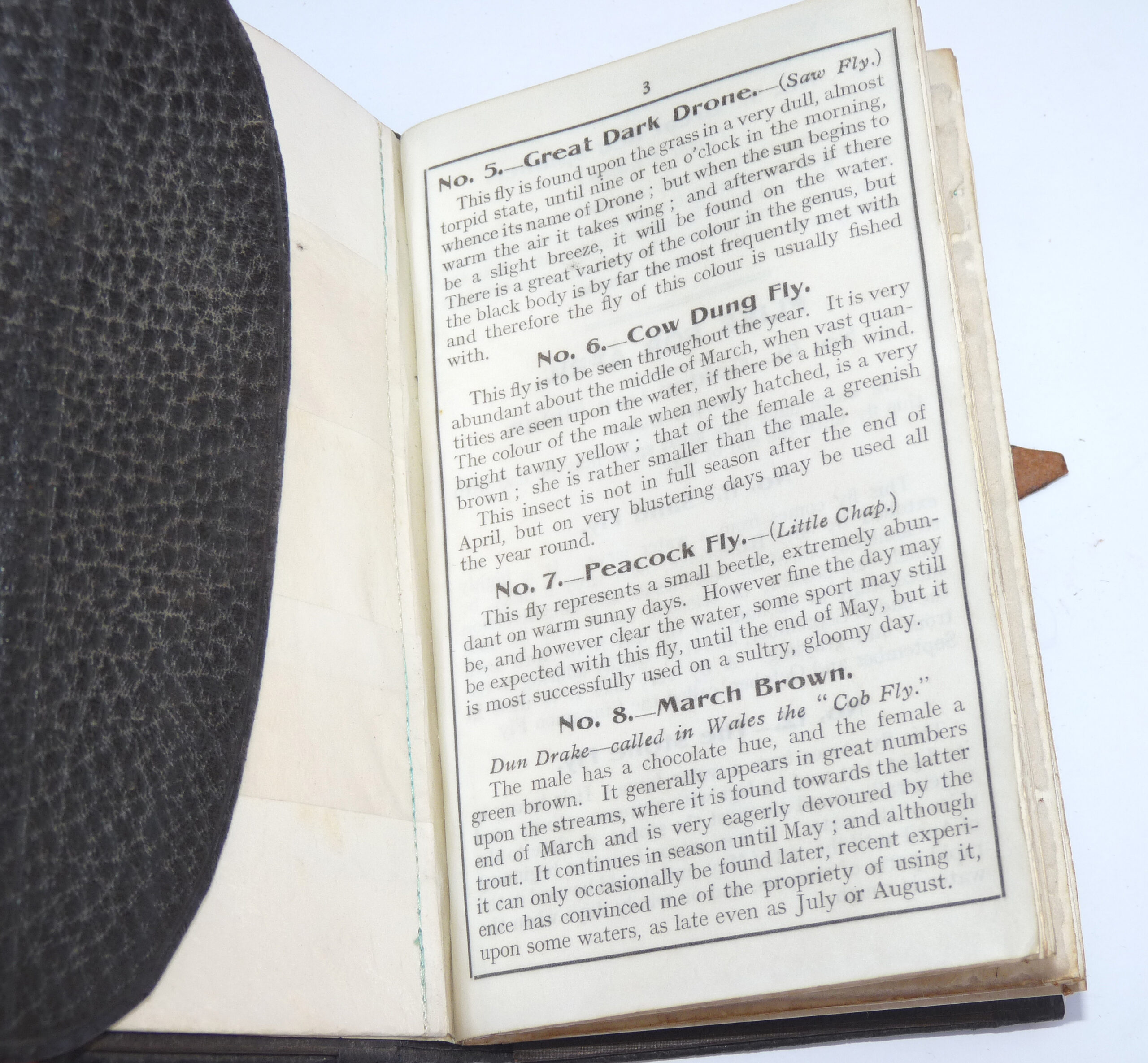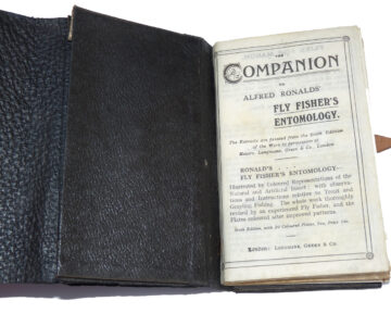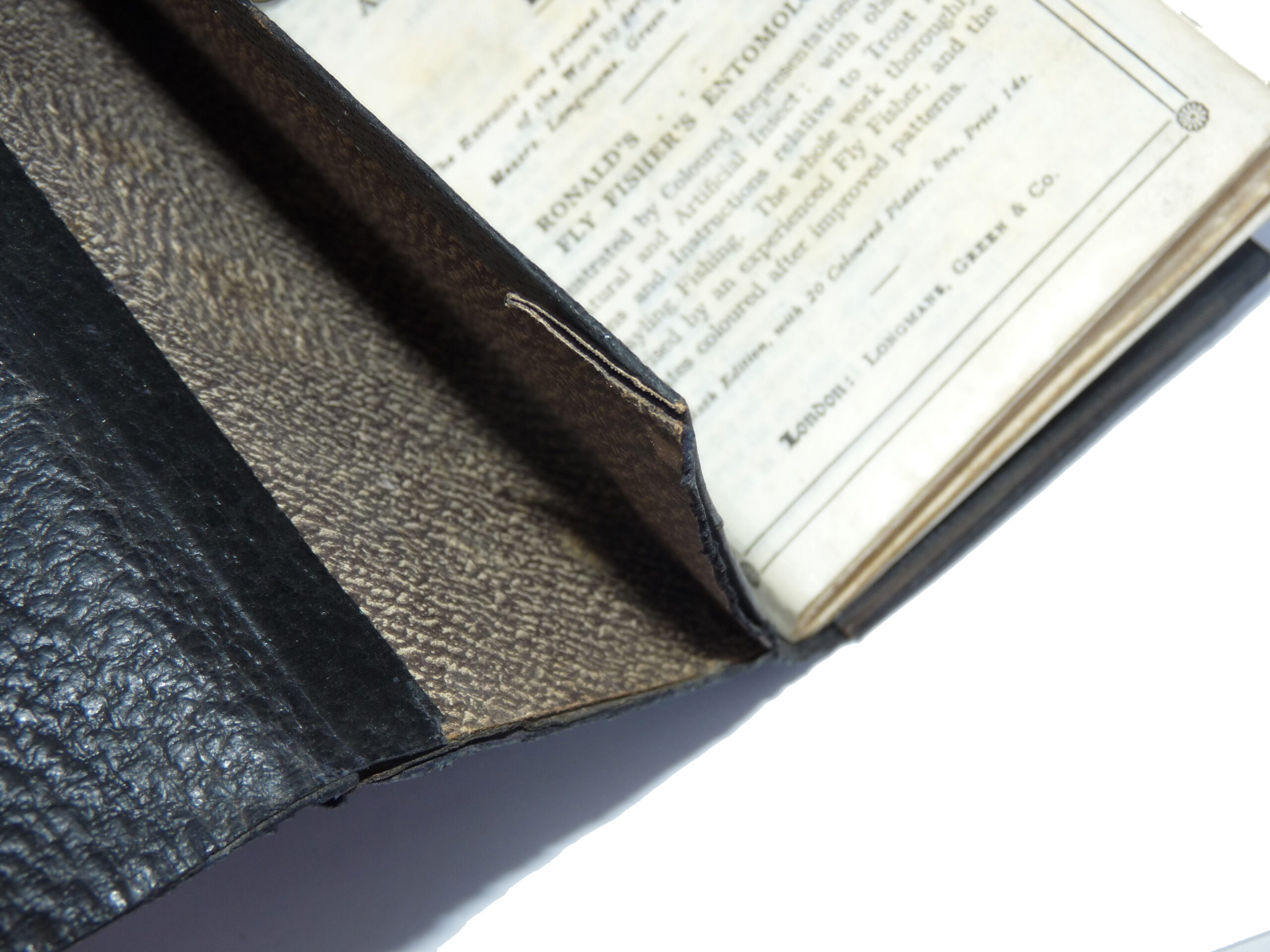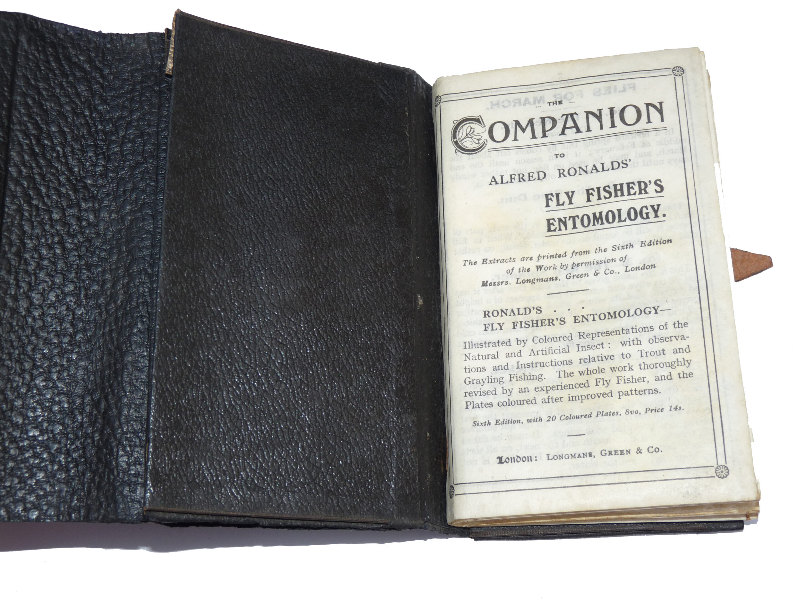 A fine Companion to Alfred Ronalds’ Entomology fly book in leather wallet, Longmans Green London edition, super clean printed interior with felt pad separators, (a few moth holes here n there but this is normal with this felt), fine condition leather with original strap and buckle, front envelope need re-glued only a great addition and a ton of fun for you to fill with the correct flies!