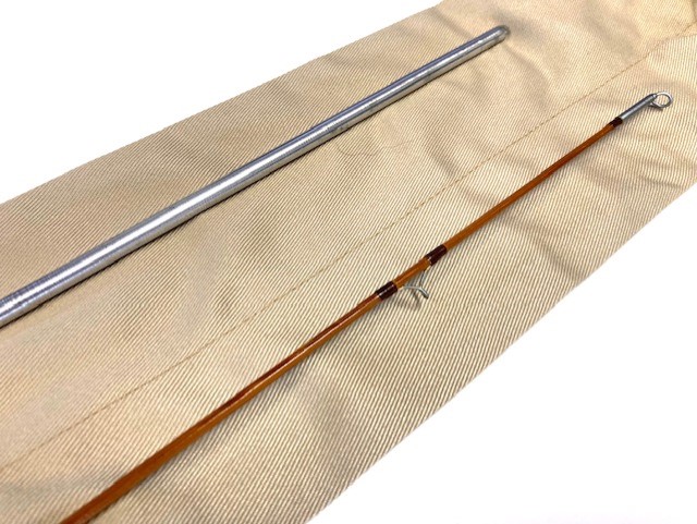 TT opinion: A superb two piece cane rod with alloy staggered ferrule joint, honey coloured dark cane, black silk whippings, smooth cork handle with original clear wrapping attached, alloy screw in reel fittings and snake rings throughout. A very nice straight rod in fine original condition with fitted non original light beige cloth bag.