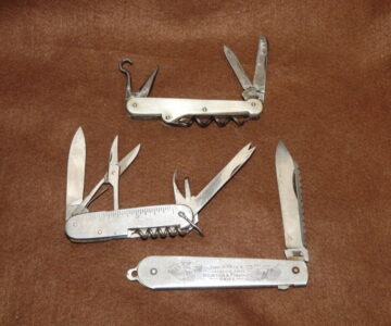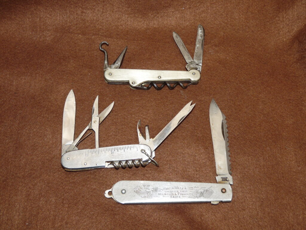 A lot of 3 angling knives. Cousin Willies Hunting & Fishing Knife with decorative engraved side plate, stainless steel blade with lock button, a multi-tool angler’s knife with hook scale & measure to side plates, and a James Dixon Hunting & Fishing knife with cartridge extractor, blades & corkscrew. Good collection.