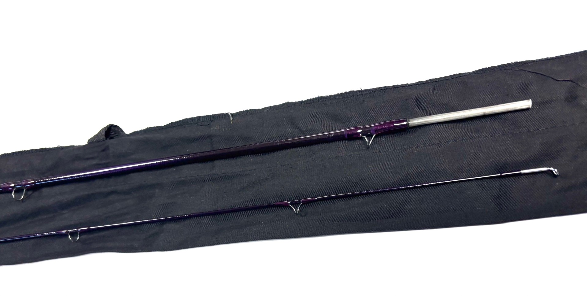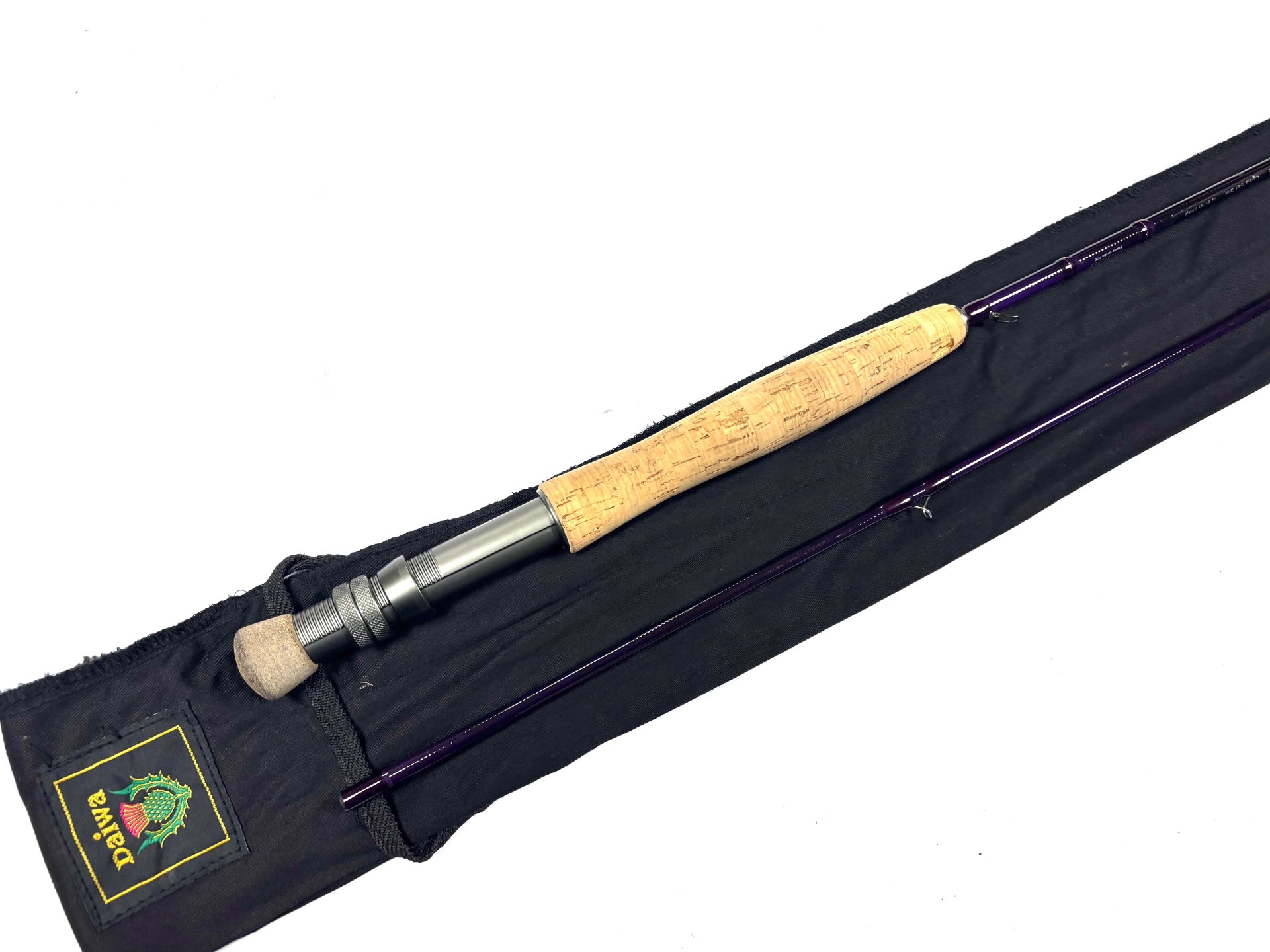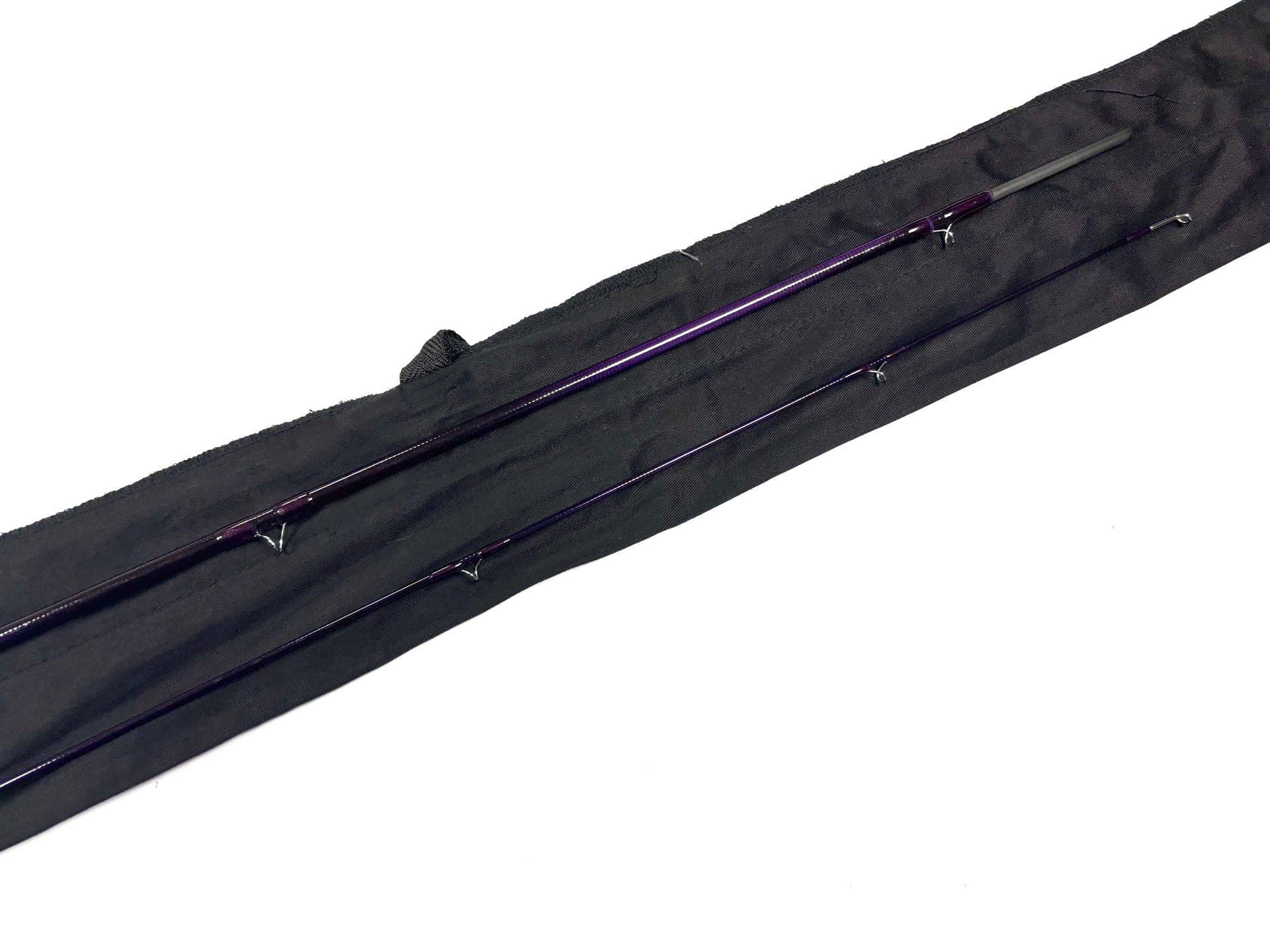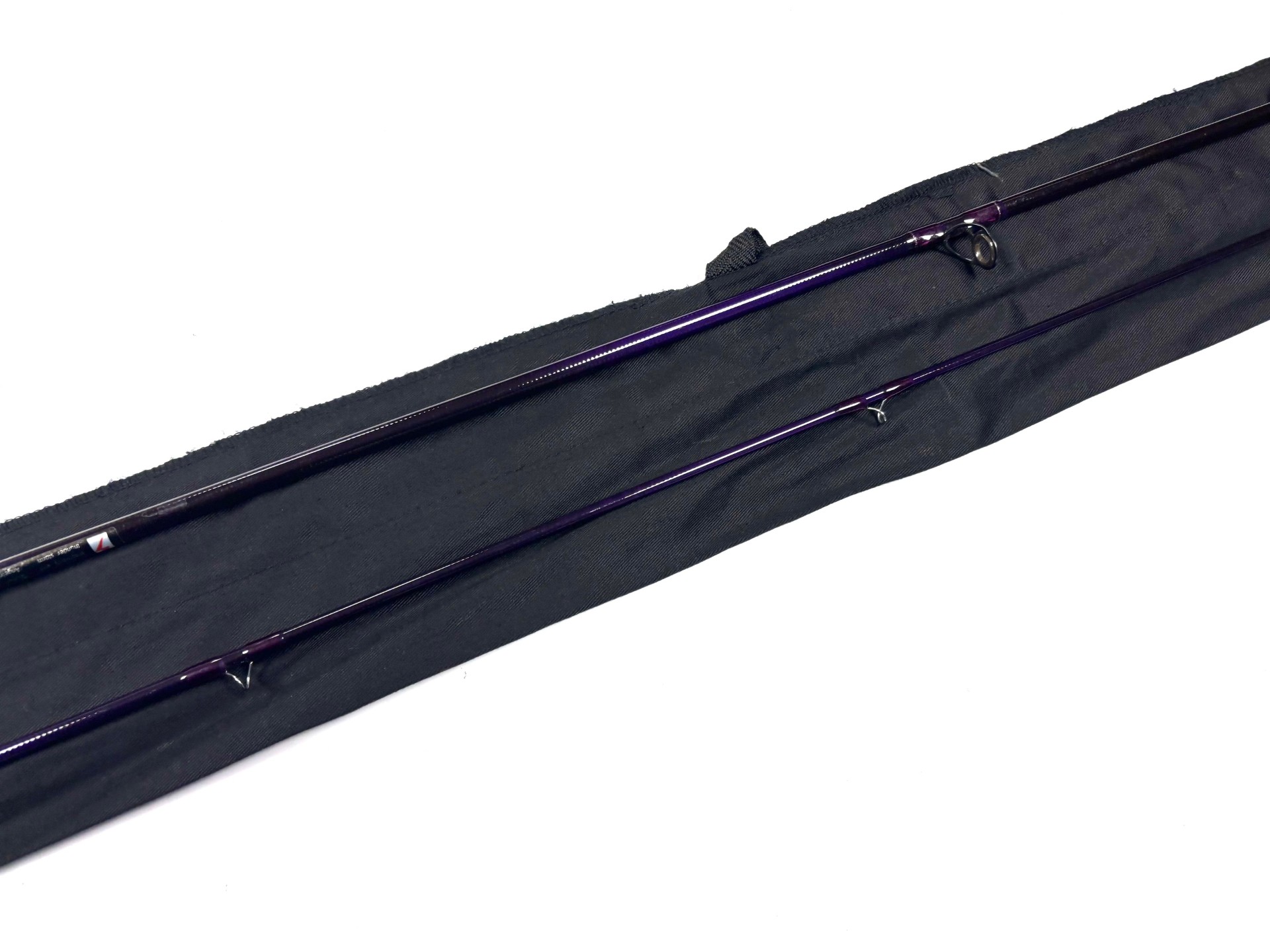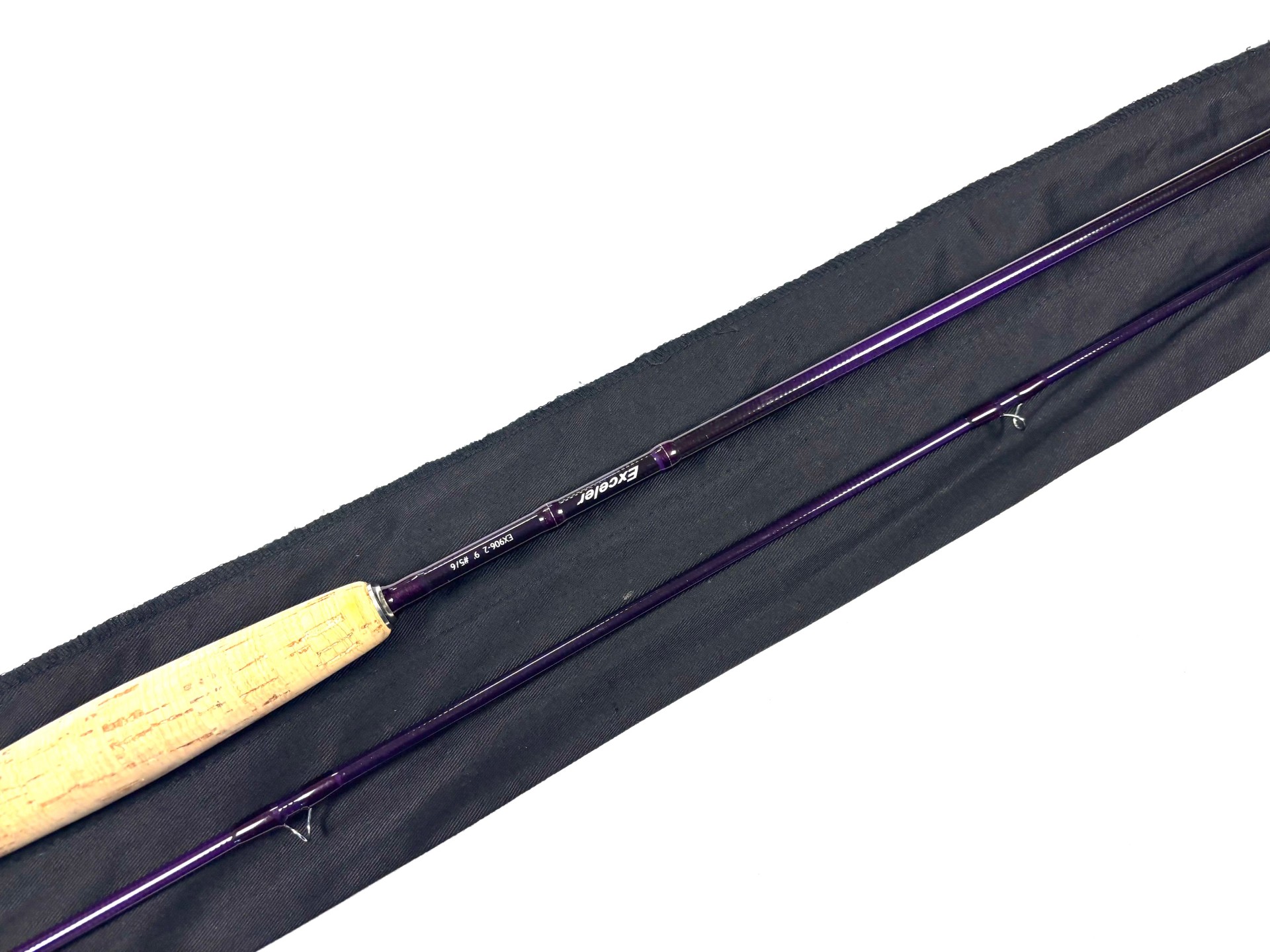 Daiwa Exceler 9′ Line #5/6 Lightweight Two Piece Trout Fly Rod on purple metallic blank, smooth shaped cork handle and lined guides with black cloth rod bag.