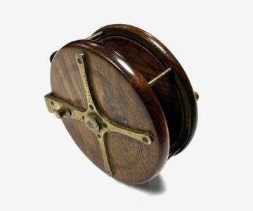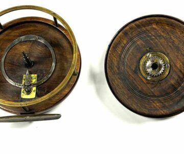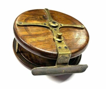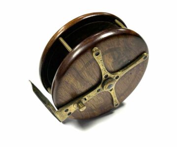TT opinion: A very fine example of Slaters 5″ Combination reel fitted with the 3 screw drum latch and polished horn handles, brass starback stamped with makers details and reel number 1508. Working on off ratchet. The reel spins well, unusual in this large size. One for the collector!