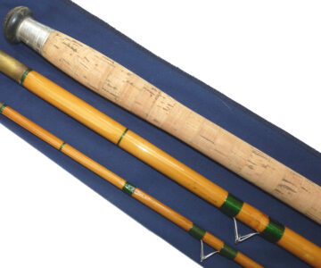 A Dawson of Bromley, the Elaine 13’6 hollow bamboo 3-piece vintage coarse fishing rod with spliced split cane tip. Full cosmetic refurbishment, thick & thin green whippings, agate butt, and tip rings, bronze push ferrules. 27” cork handle with light-alloy sliding reel rings & butt cap, black rubber button. A stunning looking rod from the 50s in ready-to-fish usable condition comes in the maker’s cloth bag.