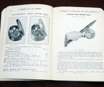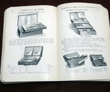 This is a rare early Farlow of London 1909 anglers guide catalogue. Pocket-sized 6-1/2″ x 4-1/2″, with red cloth cover, 206 pages. Fully illustrated with some fabulous rare tackle, this is a great collectors reference guide to models, sizes and prices. Appears complete and in fine condition.
