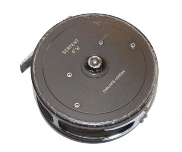 Farlow’s of London “The Serpent” 4” W alloy salmon fly reel in fine condition, Holdfast nickel plated twin line guide for left and right-hand wind, quick release drum with correct 68mm smooth alloy foot, the reel winds smooth & well, comes with a spare spool in maker’s original box.