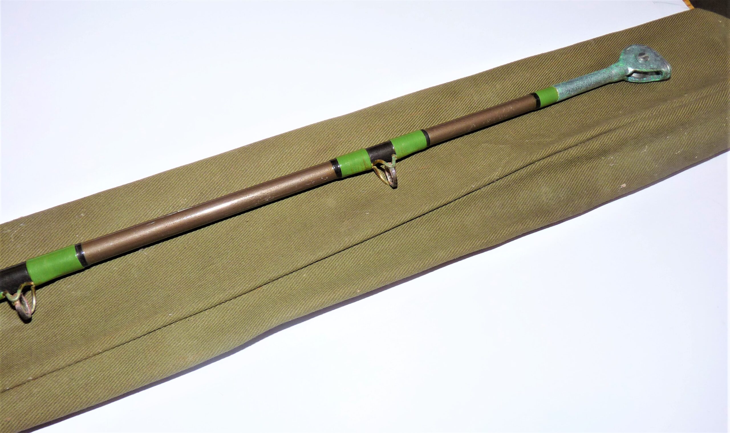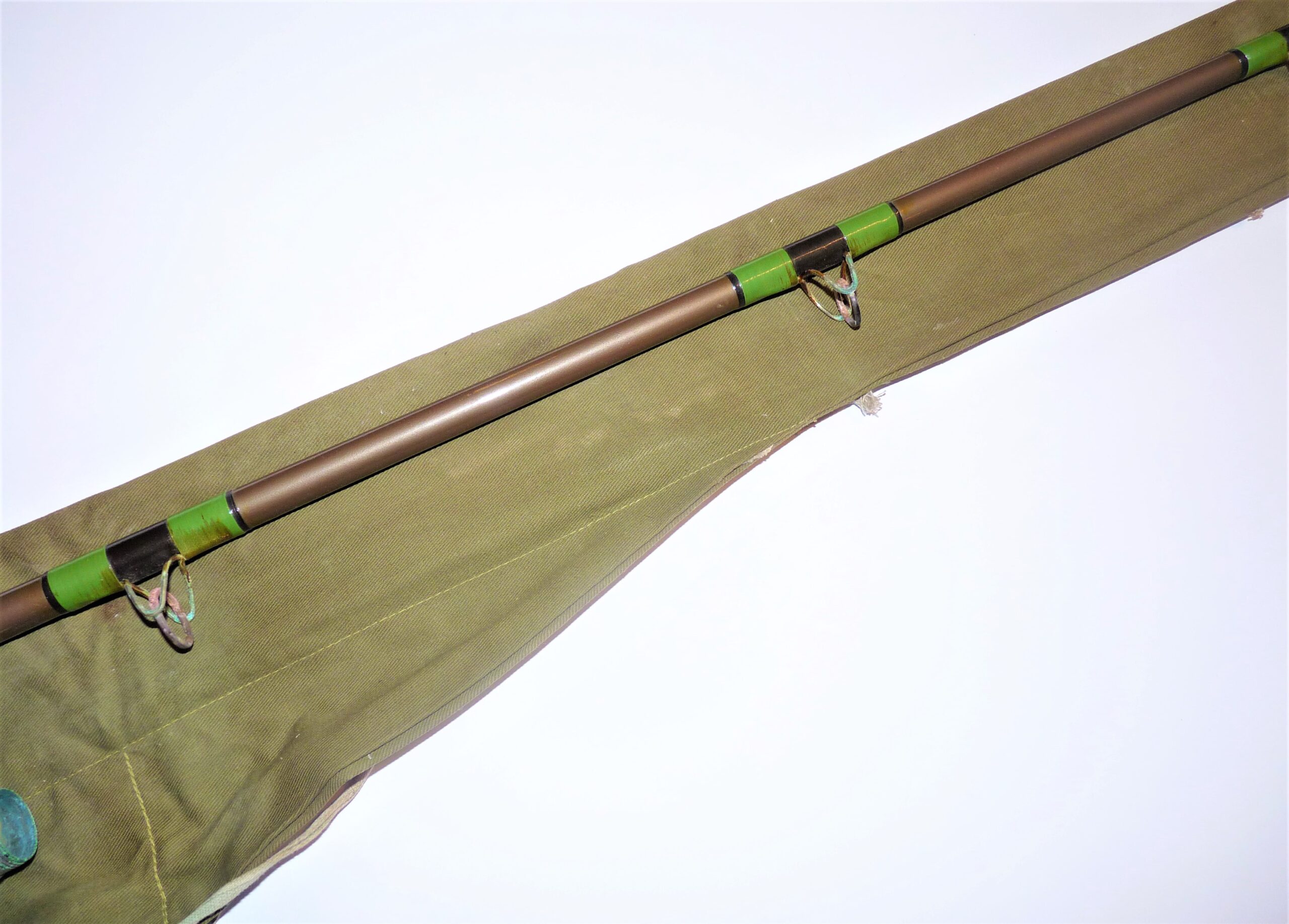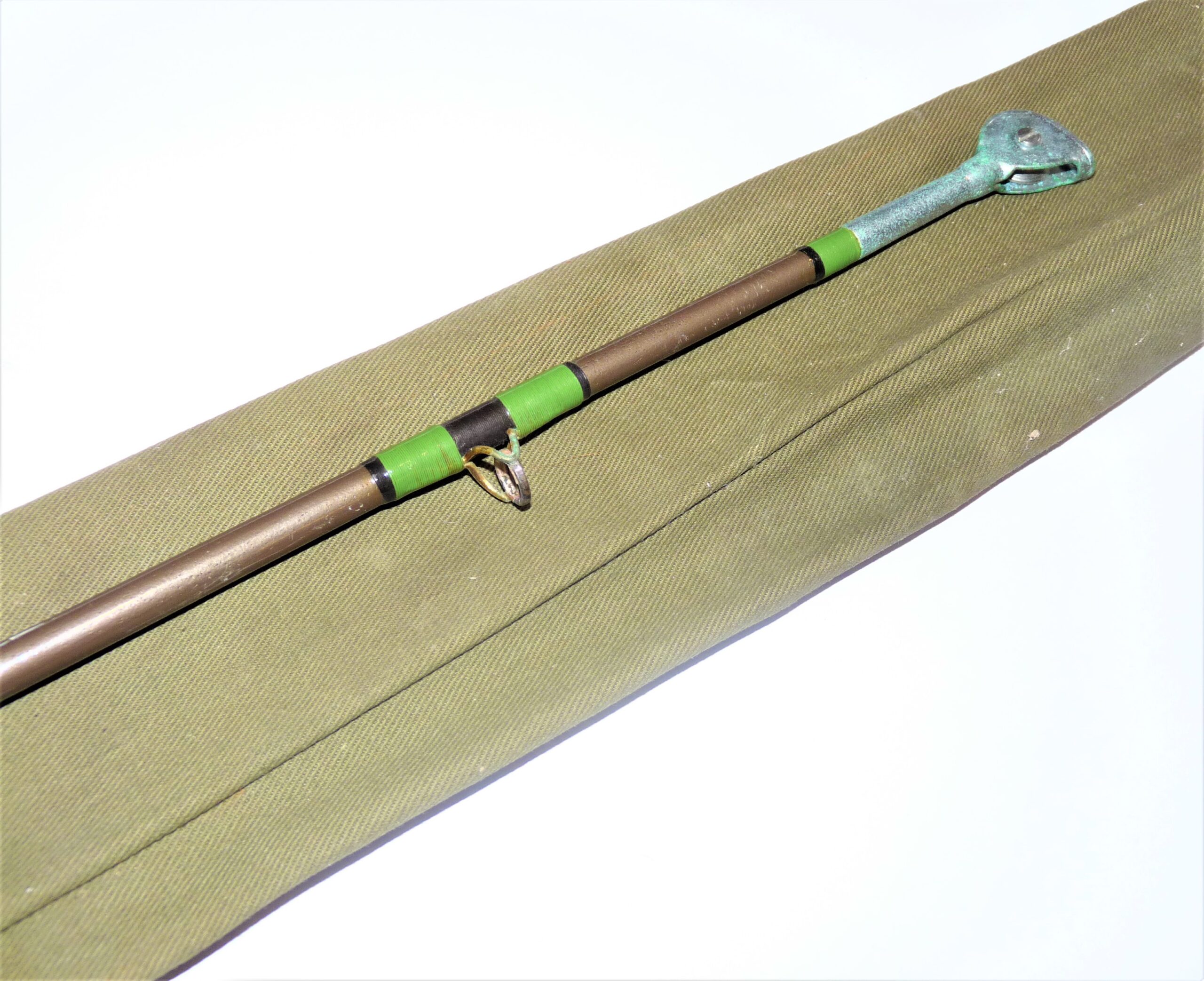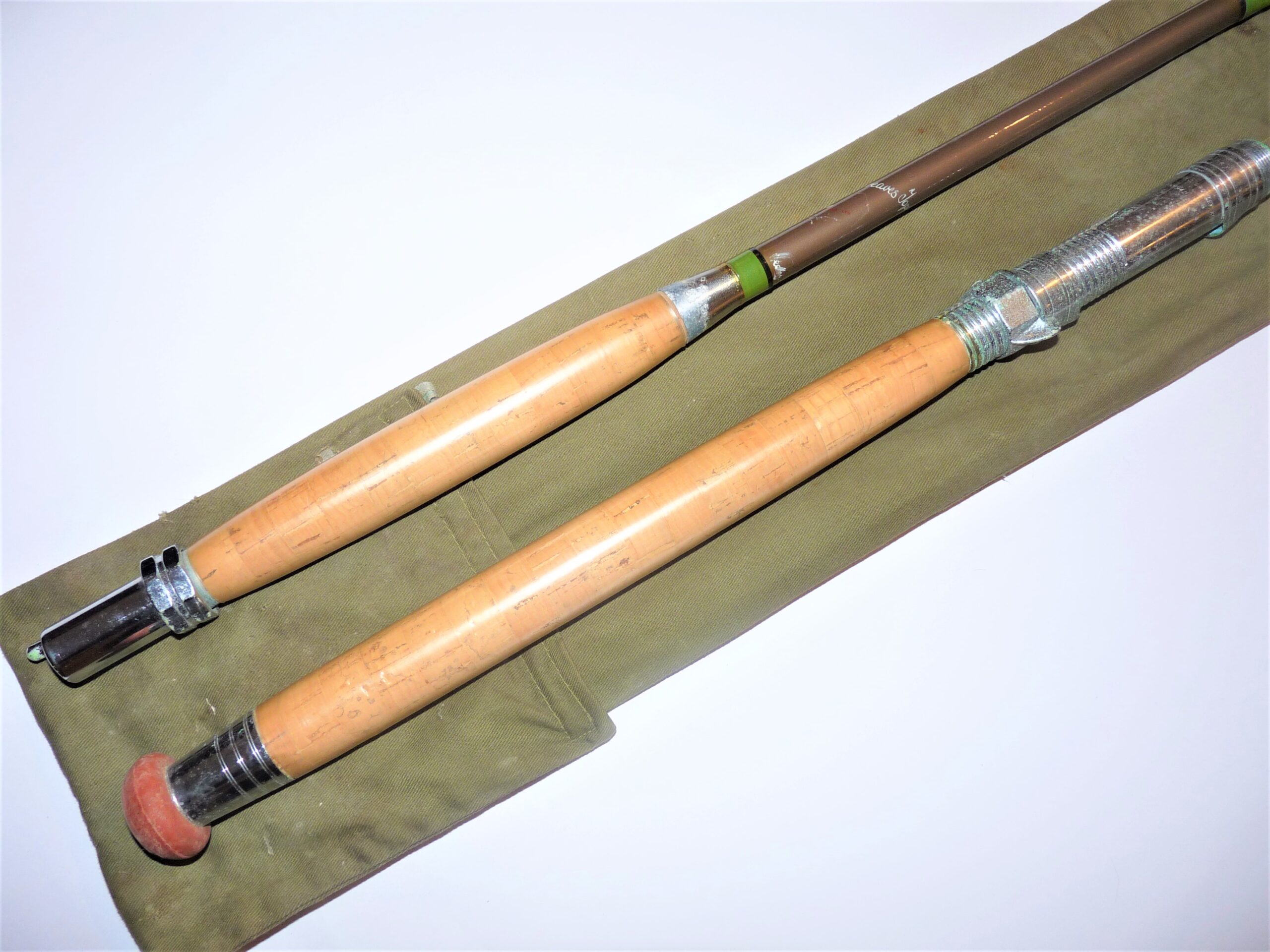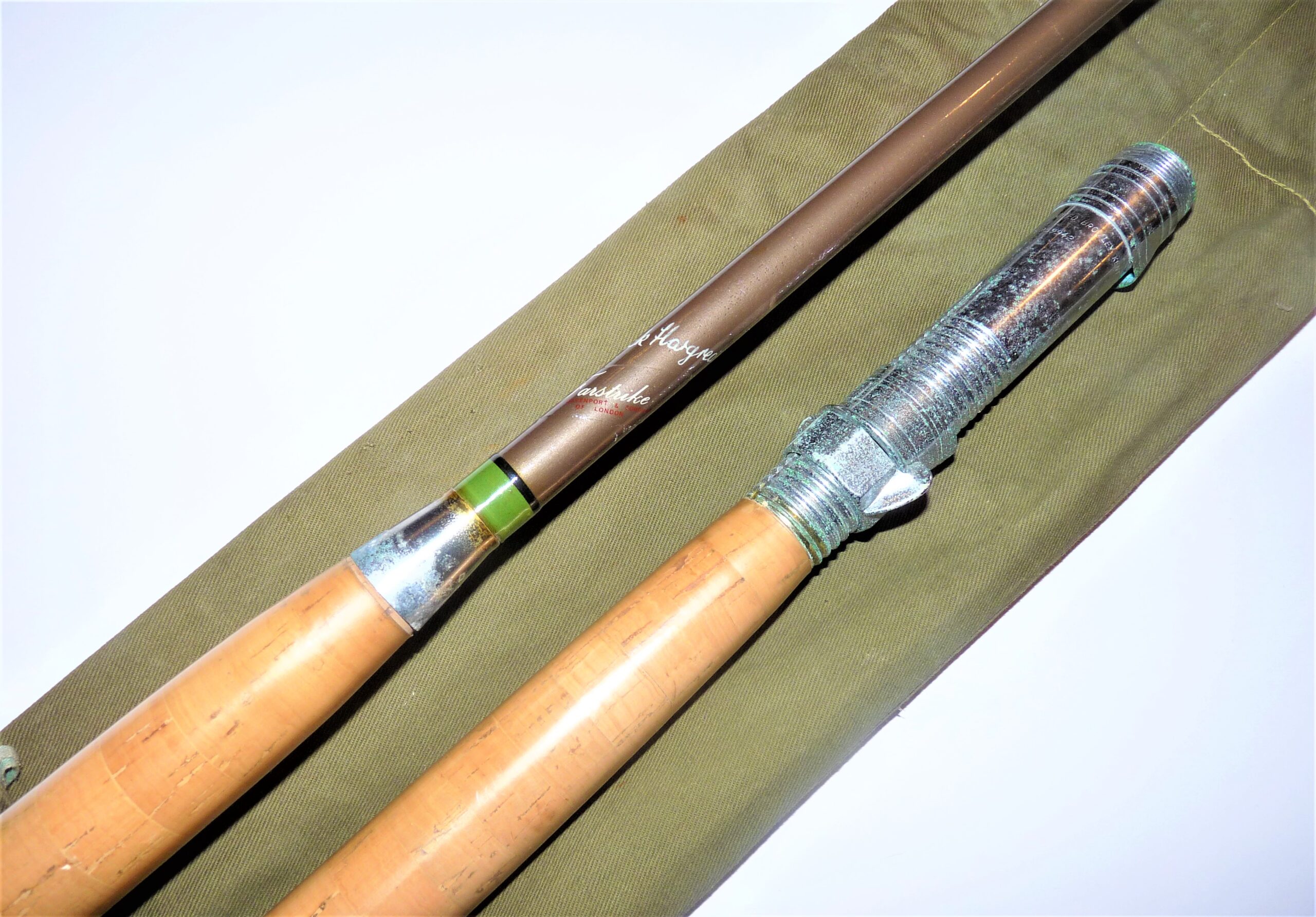 Davenport Jack Hargreaves Tope rod with double cork handle with alloy reel fittings, green whips tipped in black. Showing some signs of wear to eyes. Details are neatly inscribed to rod in white italic writing. Circa 1960s.